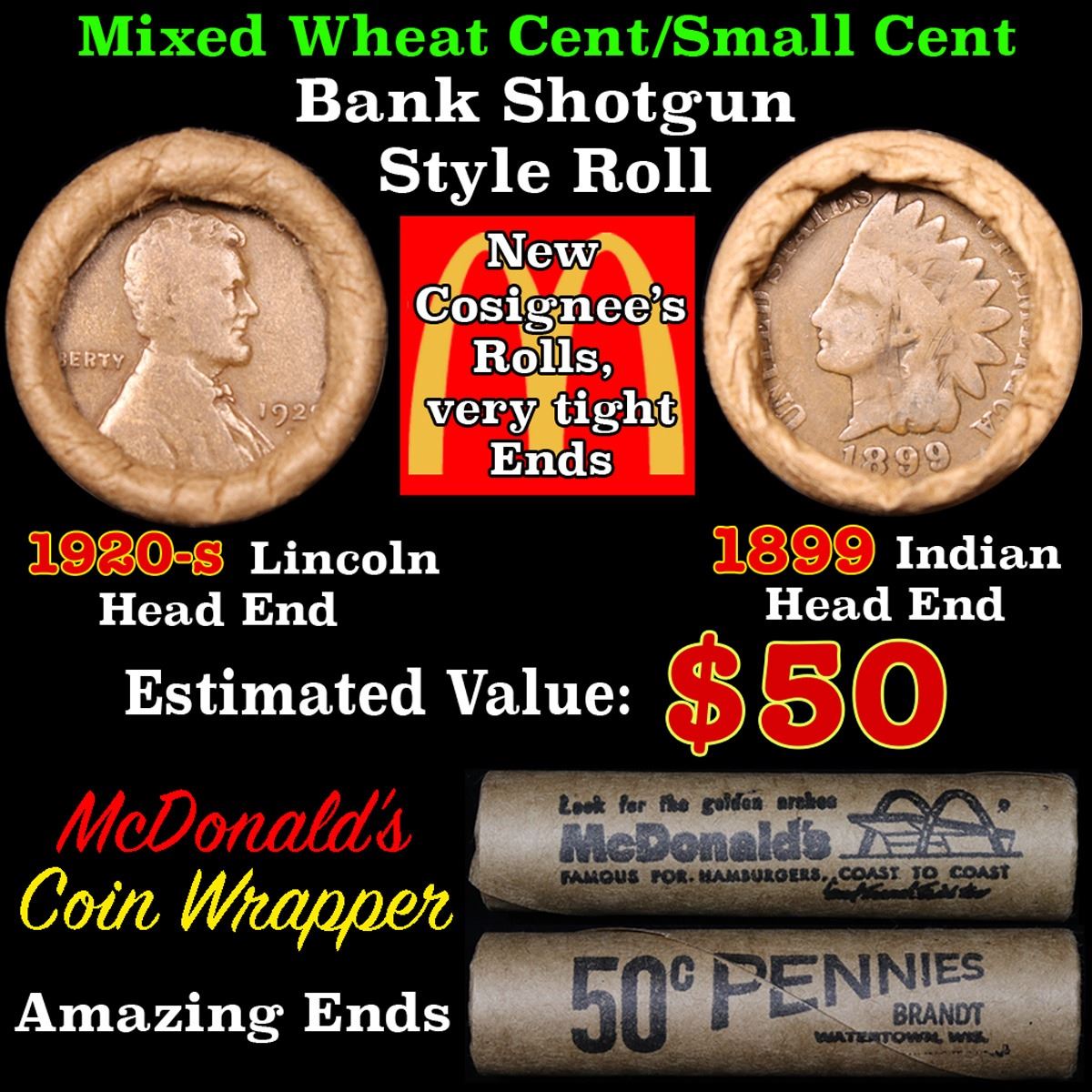 Mixed small cents 1c orig shotgun roll,1920-s Wheat Cent,1899 Indian Cent other end. The roll is held in an old Rare & Collectable McDonalds Brandt wrapper. Actual roll pictured is the roll you will get. A great original bank shotgun roll with very tight ends. We have opened a few of these rolls. They seem to be mixed small cents including Indians, Wheats, Steel cents & some Flying Eagles mixed in. These shotgun rolls are all from a new consignee. They are all frrom one Estate.