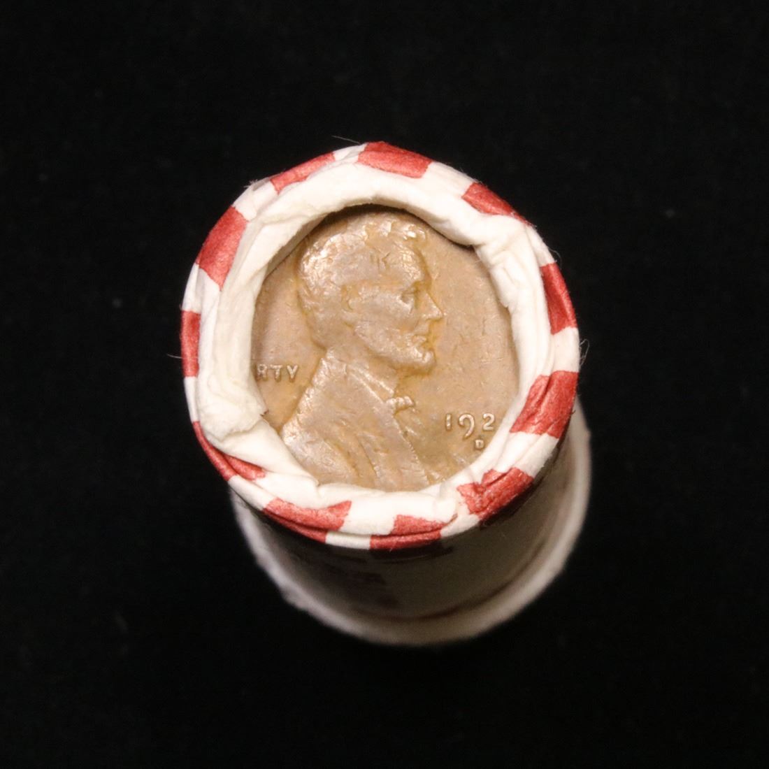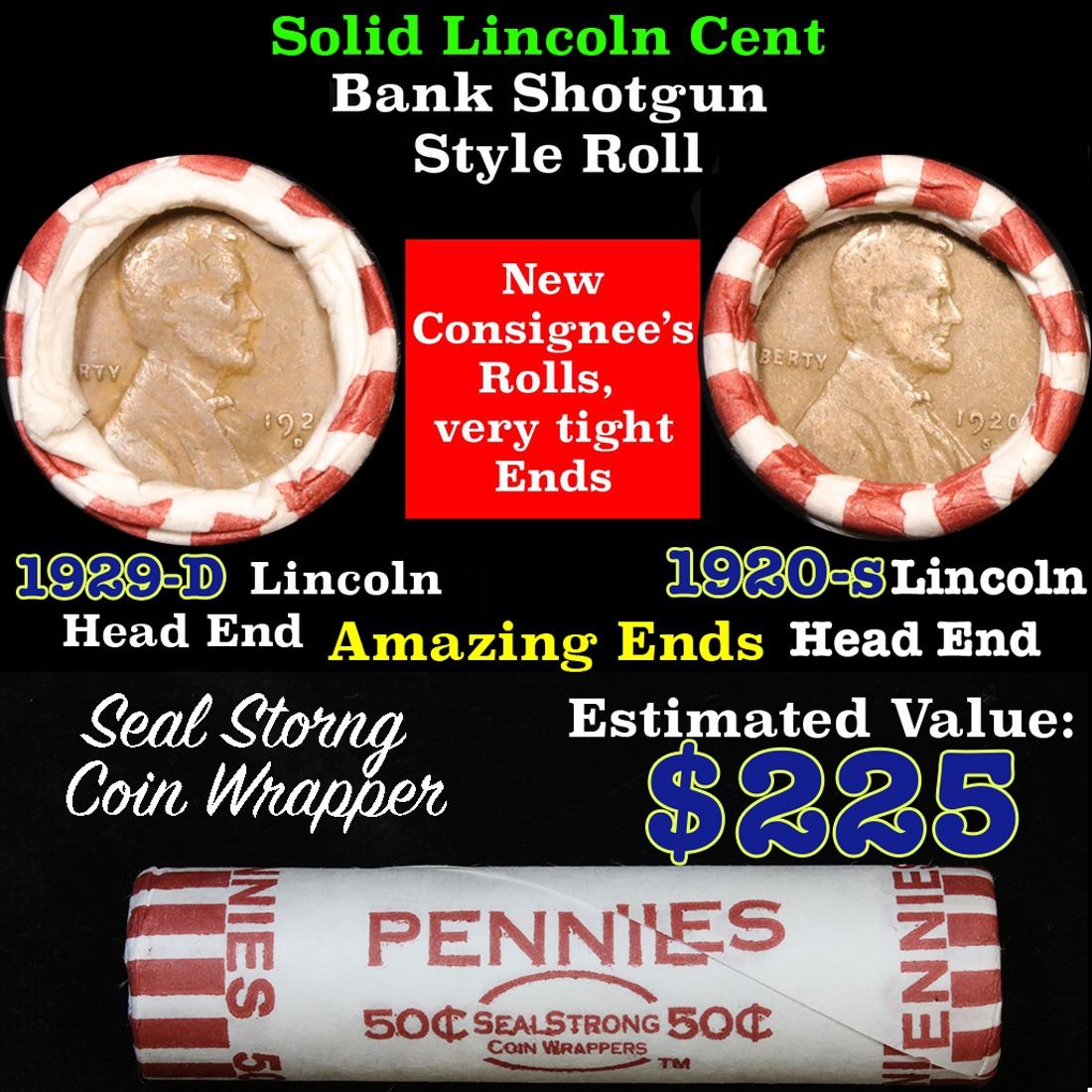 Mixed small cents 1c orig shotgun roll, 1920-s Wheat Cent, 1929-d Wheat Cent other end. The roll is held in an old Seal Strong wrapper. Actual roll pictured is the roll you will get. A great original bank shotgun roll with very tight ends. We have been getting excellent feedback on these rolls. Were being told that close to half the roll are teens, some with mintmarks, there are a few Indians in all the rolls, most of the rolls have steel cents. They seem to be PQ Wheaties rolls. These shotgun rolls are all from a new consignee. They are all frrom one Estate.