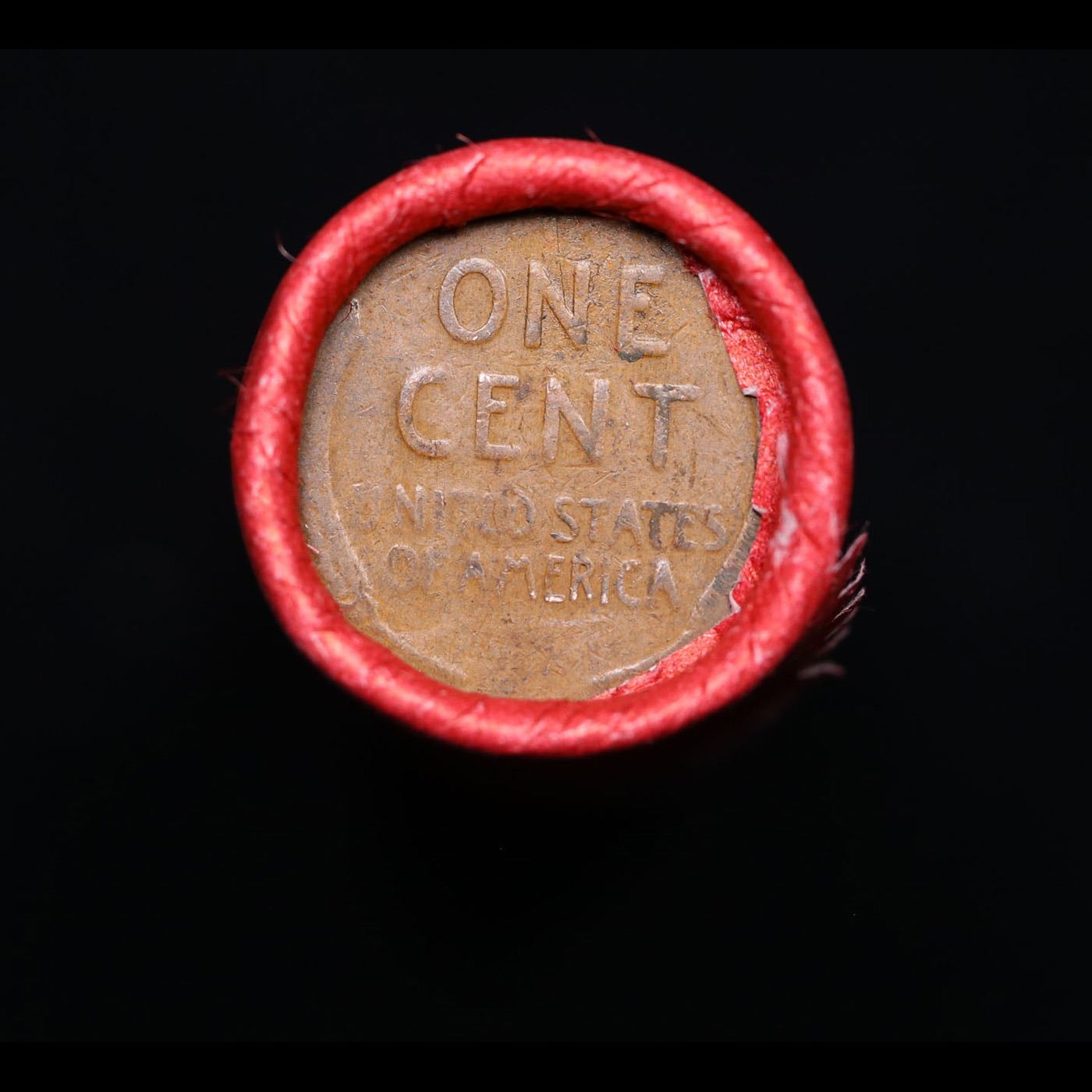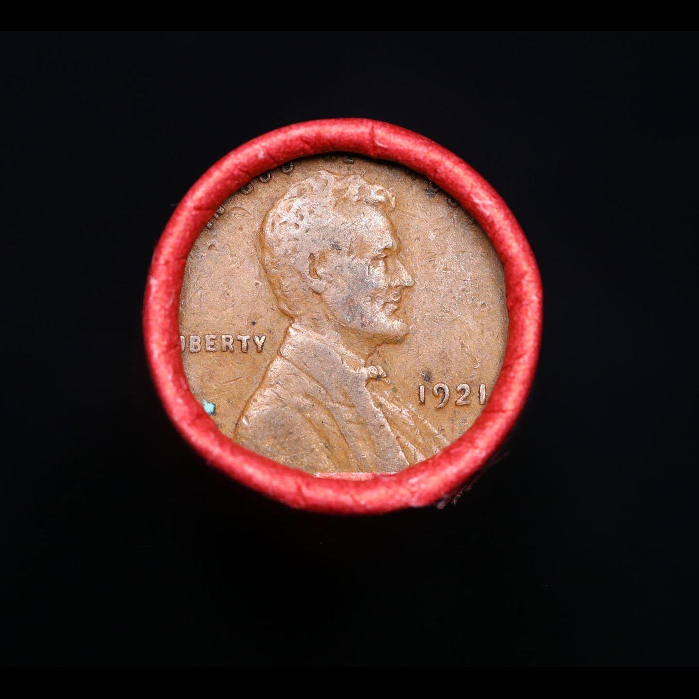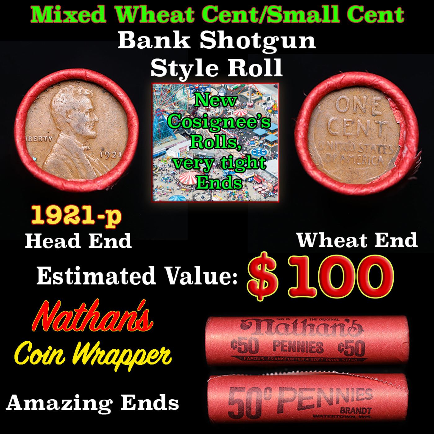 Mixed small cents 1c orig shotgun roll, 1921-p Lincoln Cent, Wheat Cent other end, Nathan's Brandt W