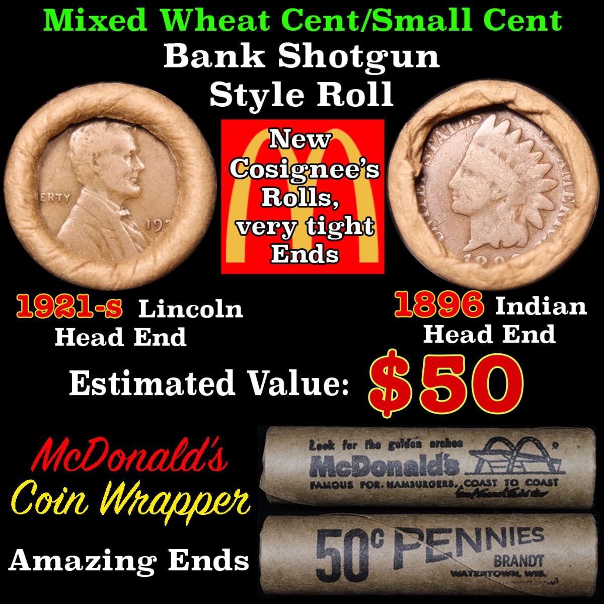 Mixed small cents 1c orig shotgun roll,1921-s Wheat Cent,1896 Indian Cent other end . . Grades. The roll is held in an old Rare & Collectable McDonalds Brandt wrapper. Actual roll pictured is the roll you will get. A great original bank shotgun roll with very tight ends. We have opened a few of these rolls. They seem to be mixed small cents including Indians, Wheats, Steel cents & some Flying Eagles mixed in. These shotgun rolls are all from a new consignee. They are all frrom one Estate.