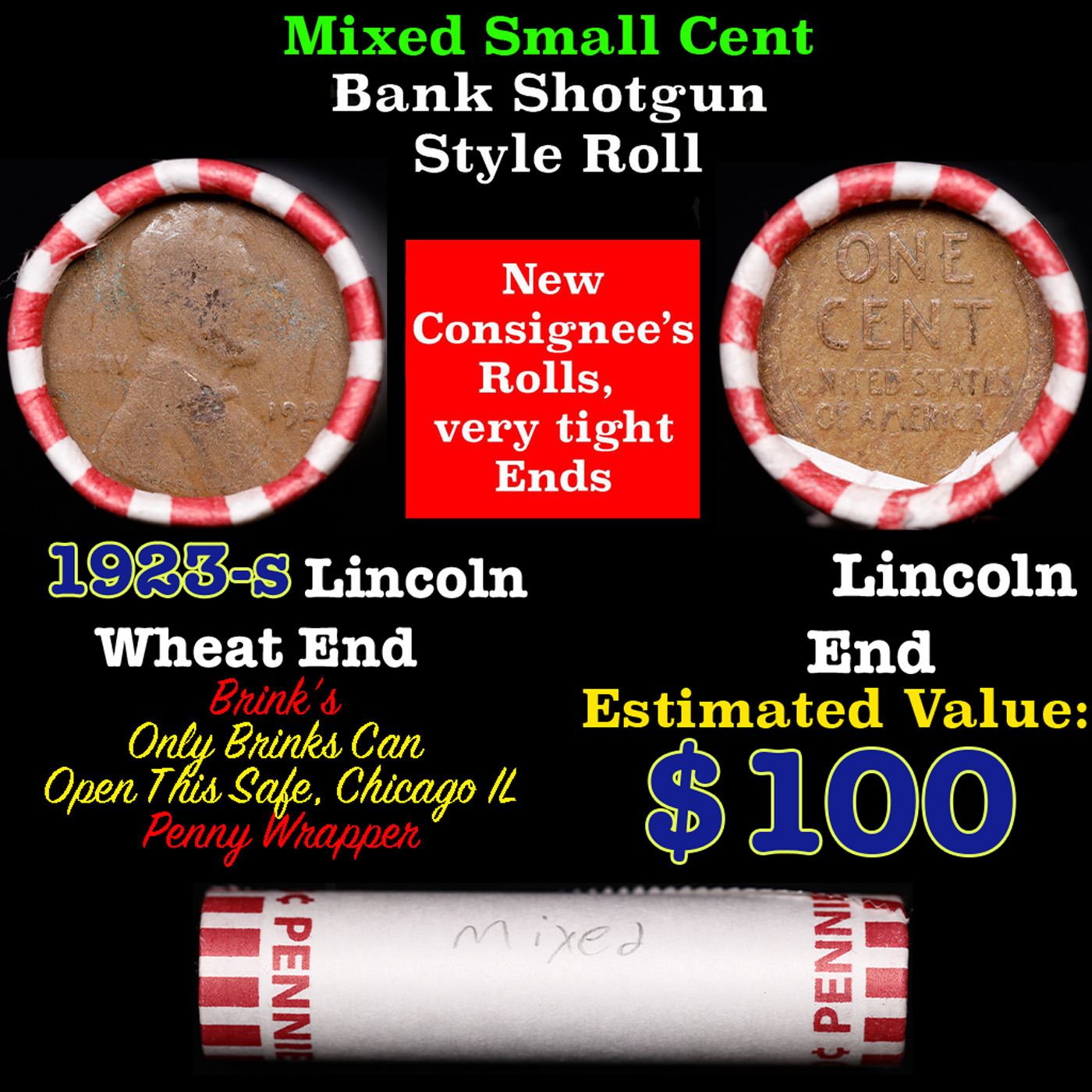 Mixed small cents 1c orig shotgun roll, 1923-s Lincoln Cent, Wheat Cent other end, Bank Wrapper. Actual roll pictured is the roll you will get. A great original bank shotgun roll with very tight ends. We have opened a few of these rolls. They seem to be mixed small cents including Indians, Wheats, Steel cents & some Flying Eagles mixed in. These shotgun rolls are all from a new consignee. They are all frrom one Estate.