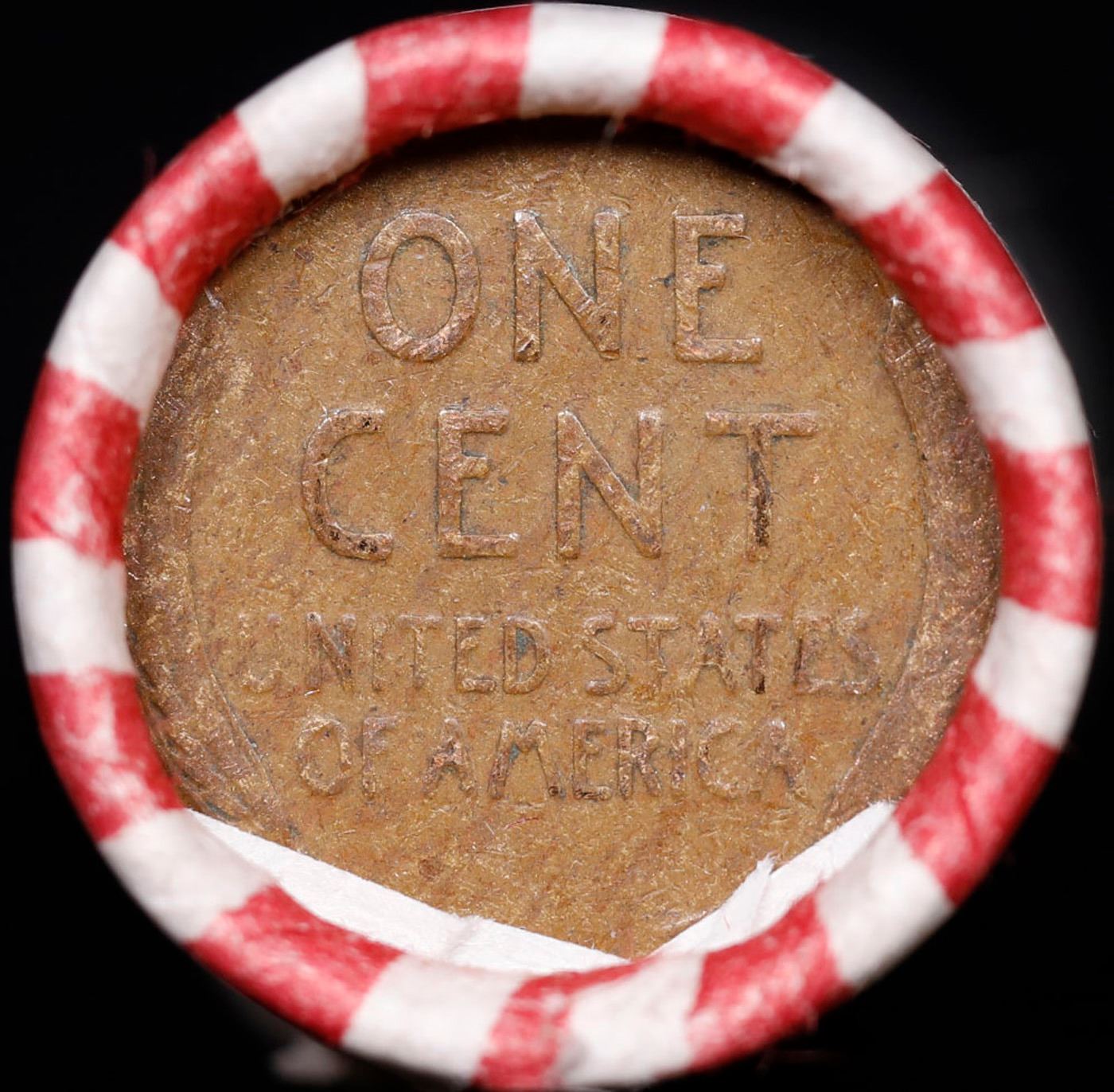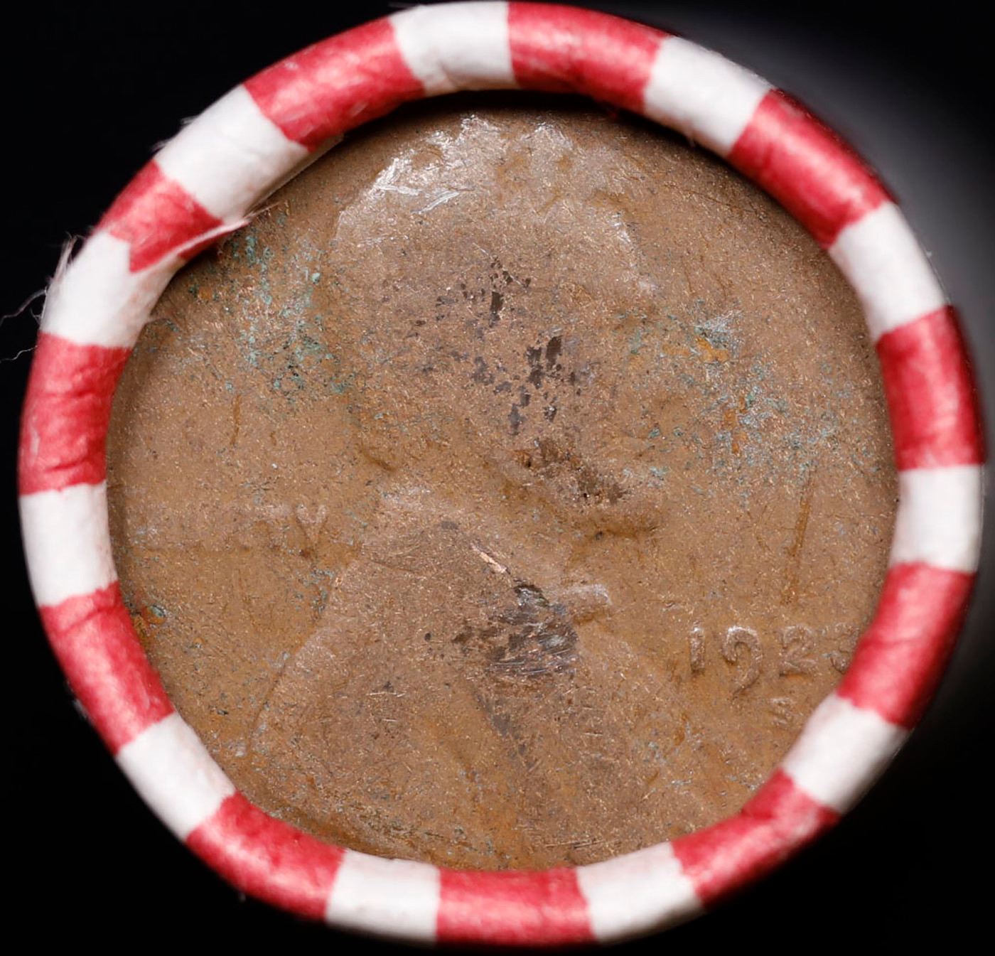 Mixed small cents 1c orig shotgun roll, 1923-s Lincoln Cent, Wheat Cent other end, Bank Wrapper