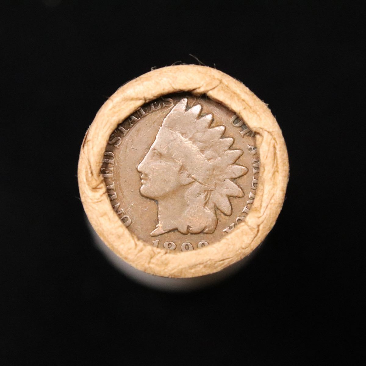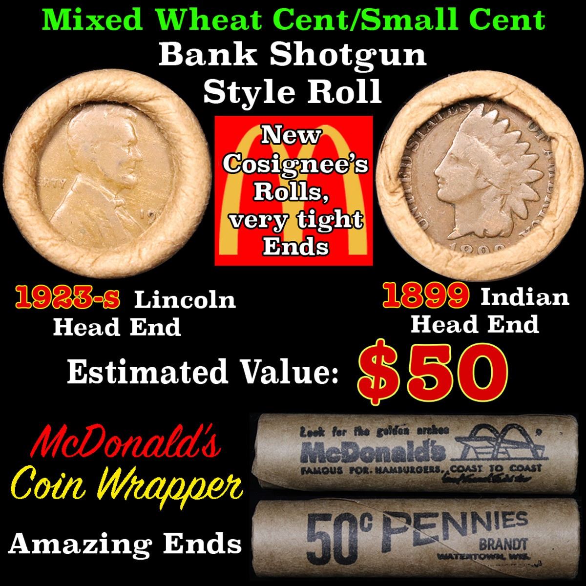 Mixed small cents 1c orig shotgun roll, 1923-s Wheat Cent, 1899 Indian Cent other end . .. The roll is held in an old Rare & Collectable McDonalds Brandt wrapper. Actual roll pictured is the roll you will get. A great original bank shotgun roll with very tight ends. We have opened a few of these rolls. They seem to be mixed small cents including Indians, Wheats, Steel cents & some Flying Eagles mixed in. These shotgun rolls are all from a new consignee. They are all frrom one Estate.