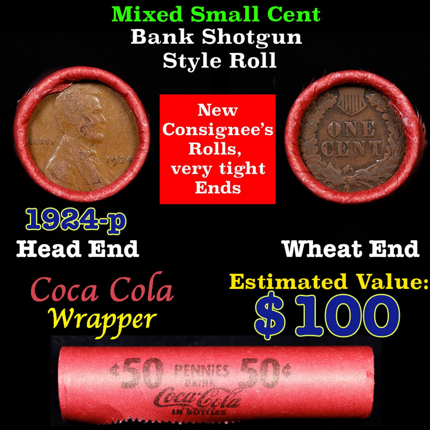 Mixed small cents 1c orig shotgun roll, 1924-p Lincoln Cent, Wheat Cent other end, Coca Cola Brandt Wrapper.. The roll is held in an old Rare & Collectable Brinks 'Only Brinks Can Open This Safe, Chicago IL' Penny wrapper. Actual roll pictured is the roll you will get. A great original bank shotgun roll with very tight ends. We have opened a few of these rolls. They seem to be mixed small cents including Indians, Wheats, Steel cents & some Flying Eagles mixed in. These shotgun rolls are all from a new consignee. They are all frrom one Estate.