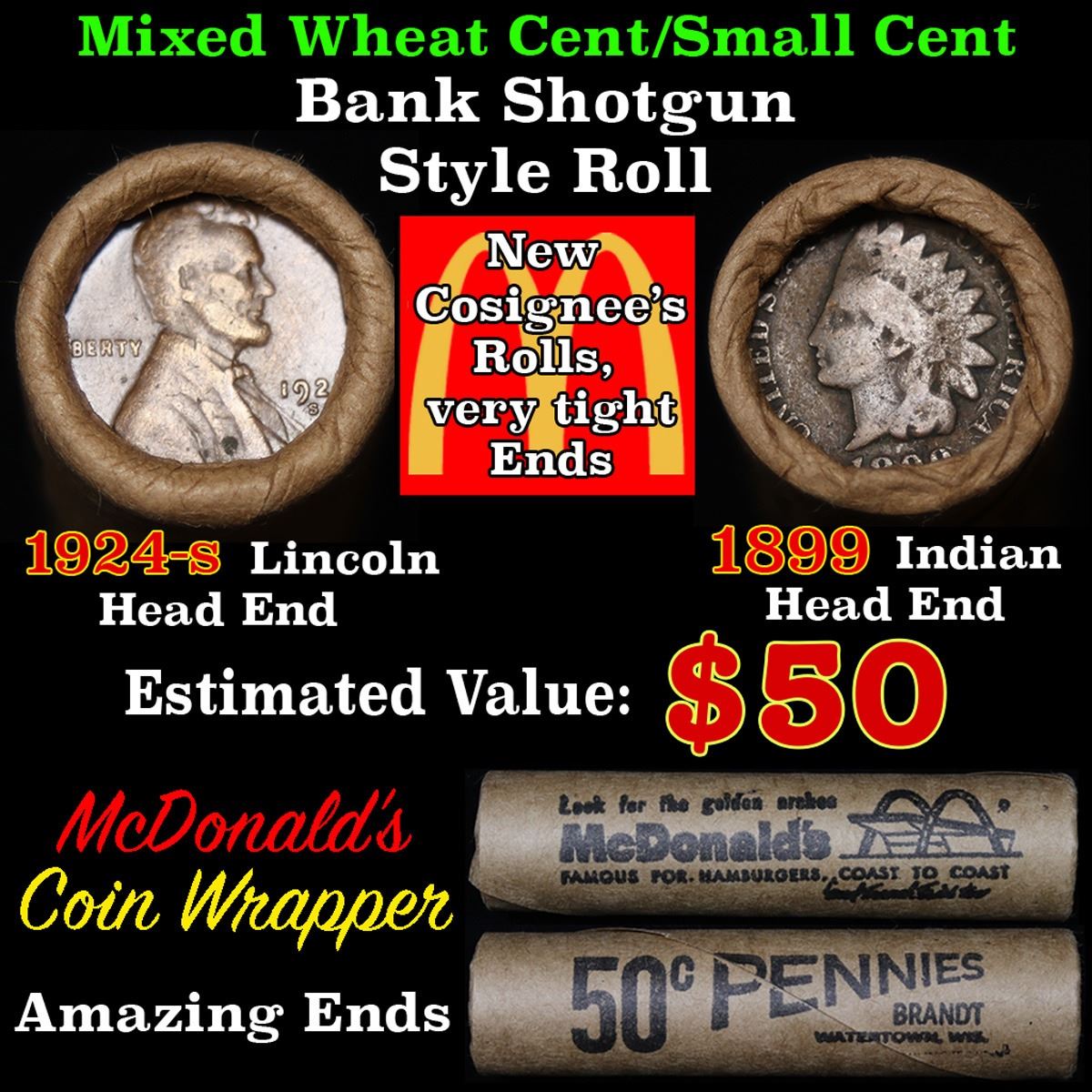 Mixed small cents 1c orig shotgun roll,1924-s Wheat Cent,1899 Indian Cent other end
