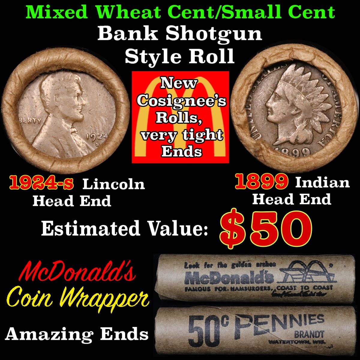 Mixed small cents 1c orig shotgun roll, 1924-s Wheat Cent, 1899 Indian Cent other end . .. The roll is held in an old Seal Strong wrapper. Actual roll pictured is the roll you will get. A great original bank shotgun roll with very tight ends. We have opened a few of these rolls. They seem to be mixed small cents including Indians, Wheats, Steel cents & some Flying Eagles mixed in. These shotgun rolls are all from a new consignee. They are all frrom one Estate.