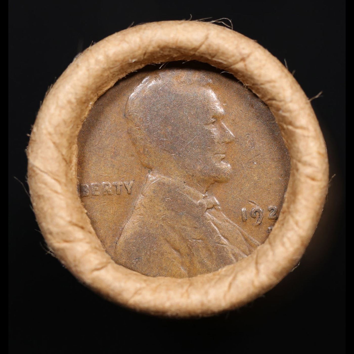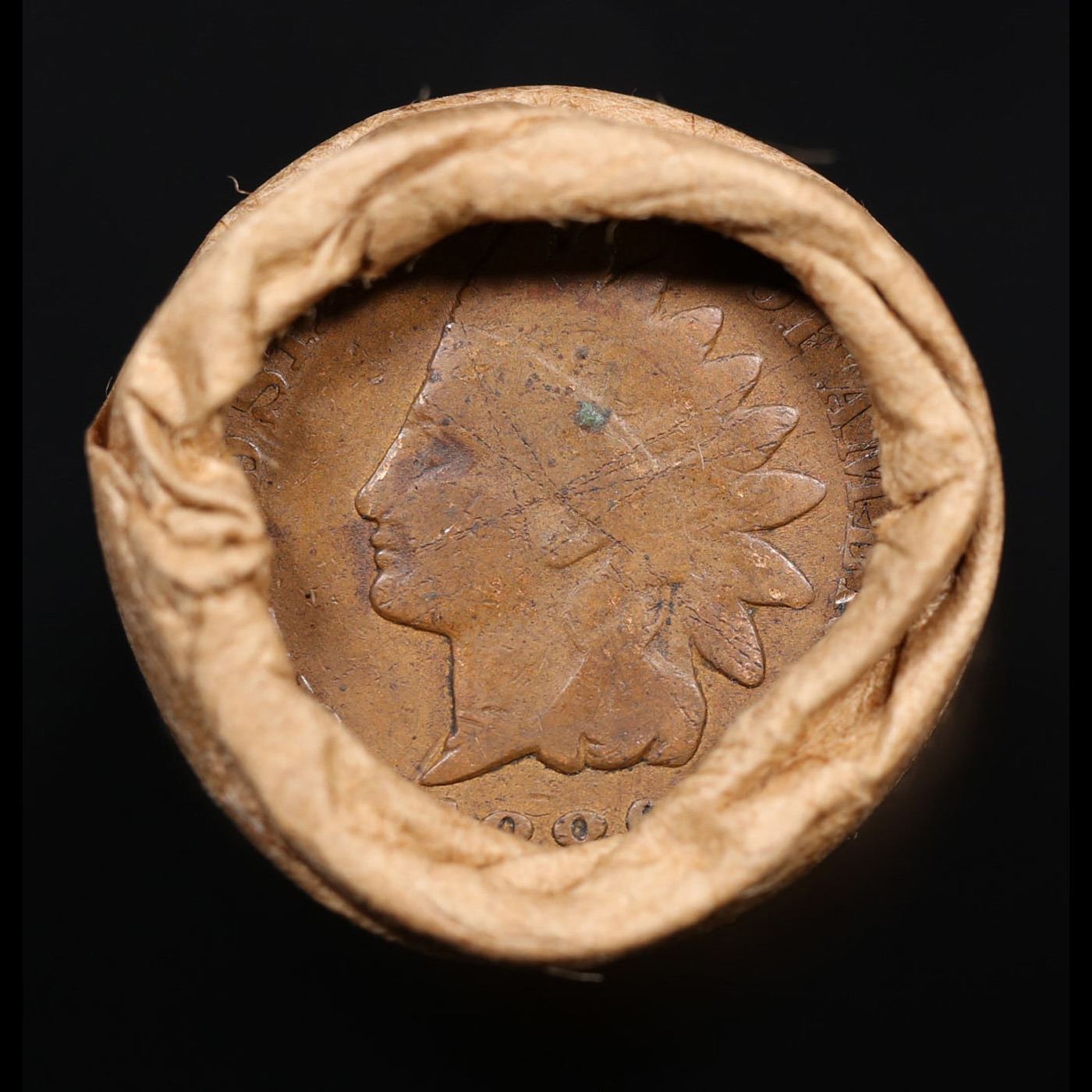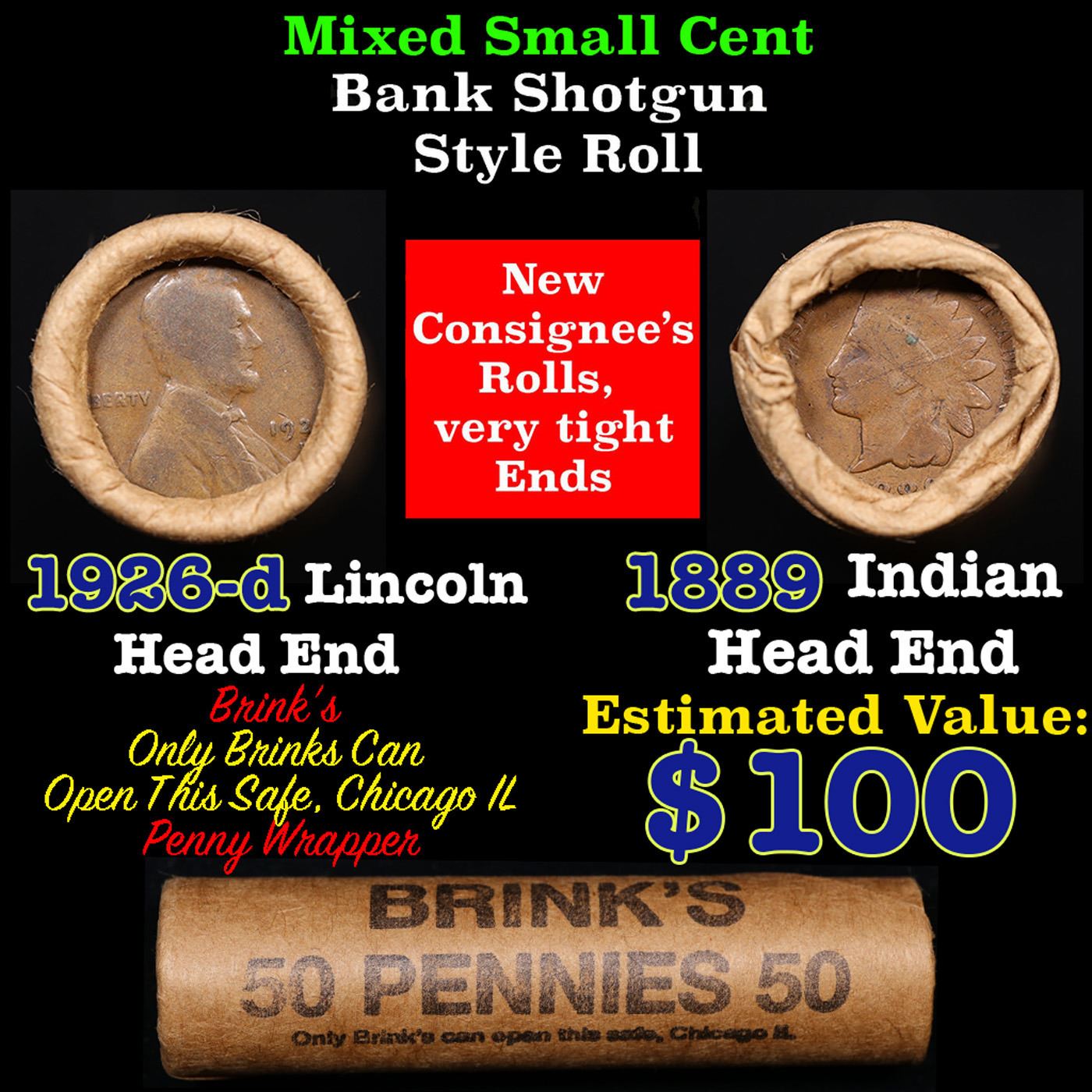 Mixed small cents 1c orig shotgun roll, 1926-d Wheat Cent, 1889 Indian Cent other end, Brinks Wrappe
