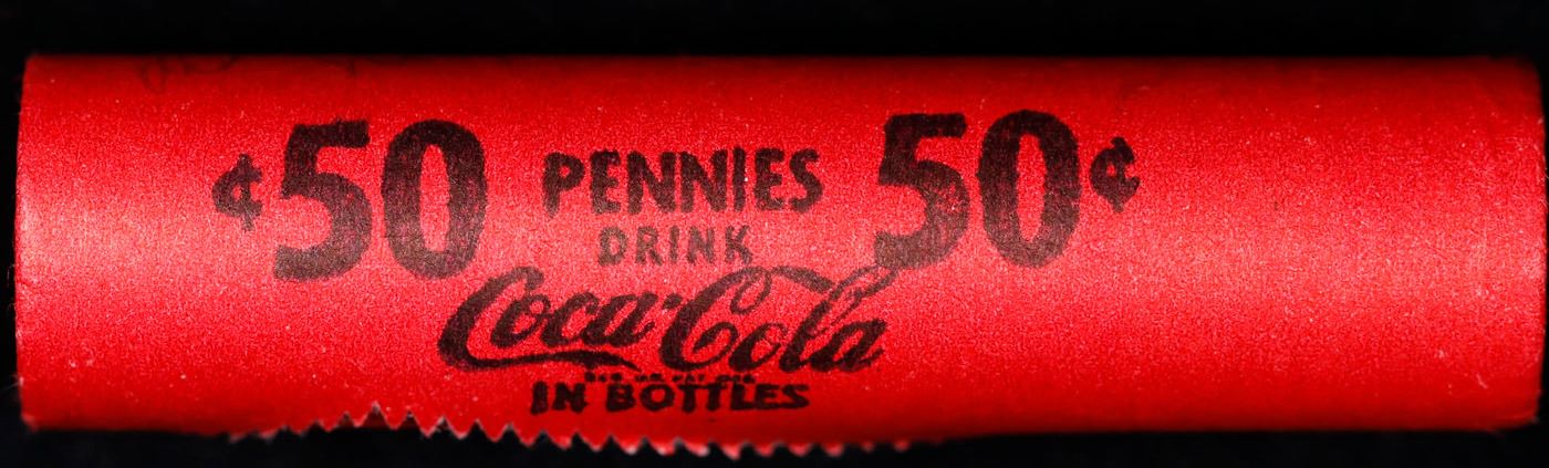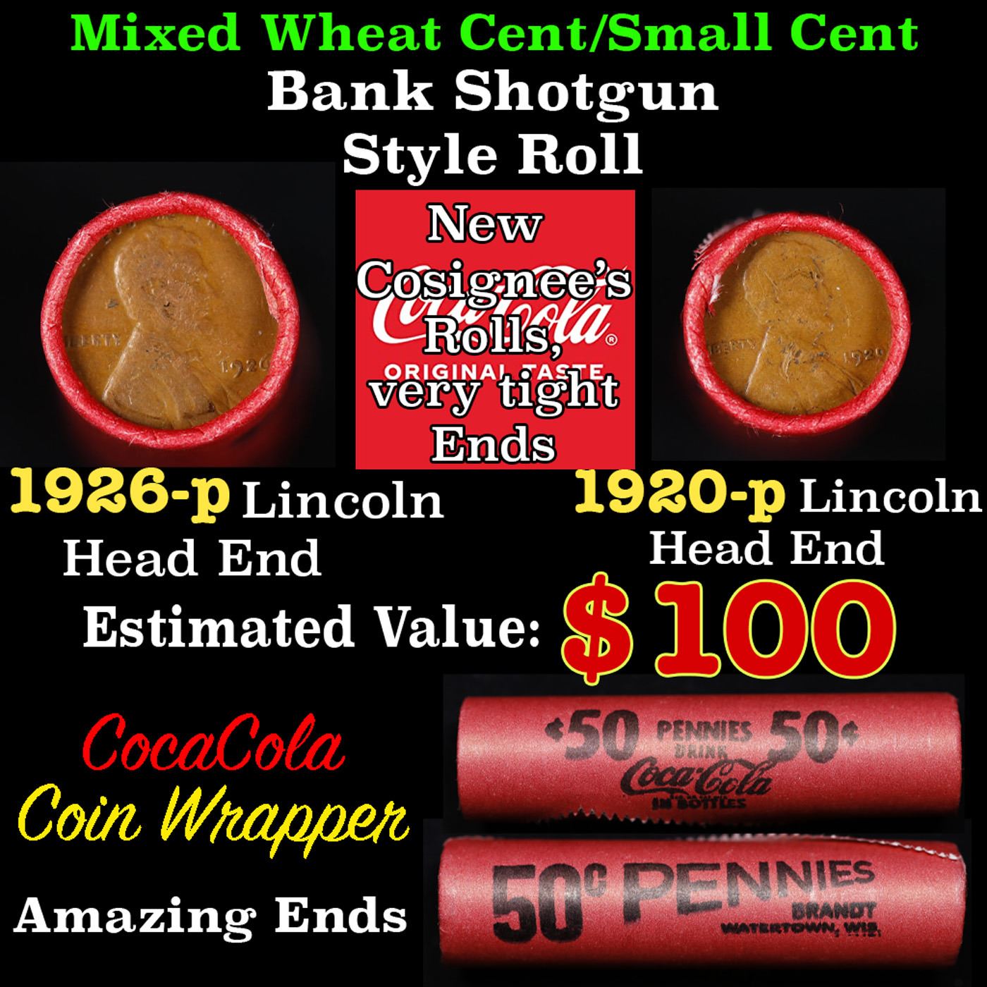 Mixed small cents 1c orig shotgun roll, 1926-p Lincoln Cent, 1920-p Lincoln Cent other end, Coca Cola Wrapper. Actual roll pictured is the roll you will get. A Brandt wrapper stamped Coca-Cola. A great original bank shotgun roll with very tight ends. We have opened a few of these rolls. They seem to be mixed small cents including Indians, Wheats, Steel cents & some Flying Eagles mixed in. These shotgun rolls are all from a new consignee. They are all frrom one Estate.