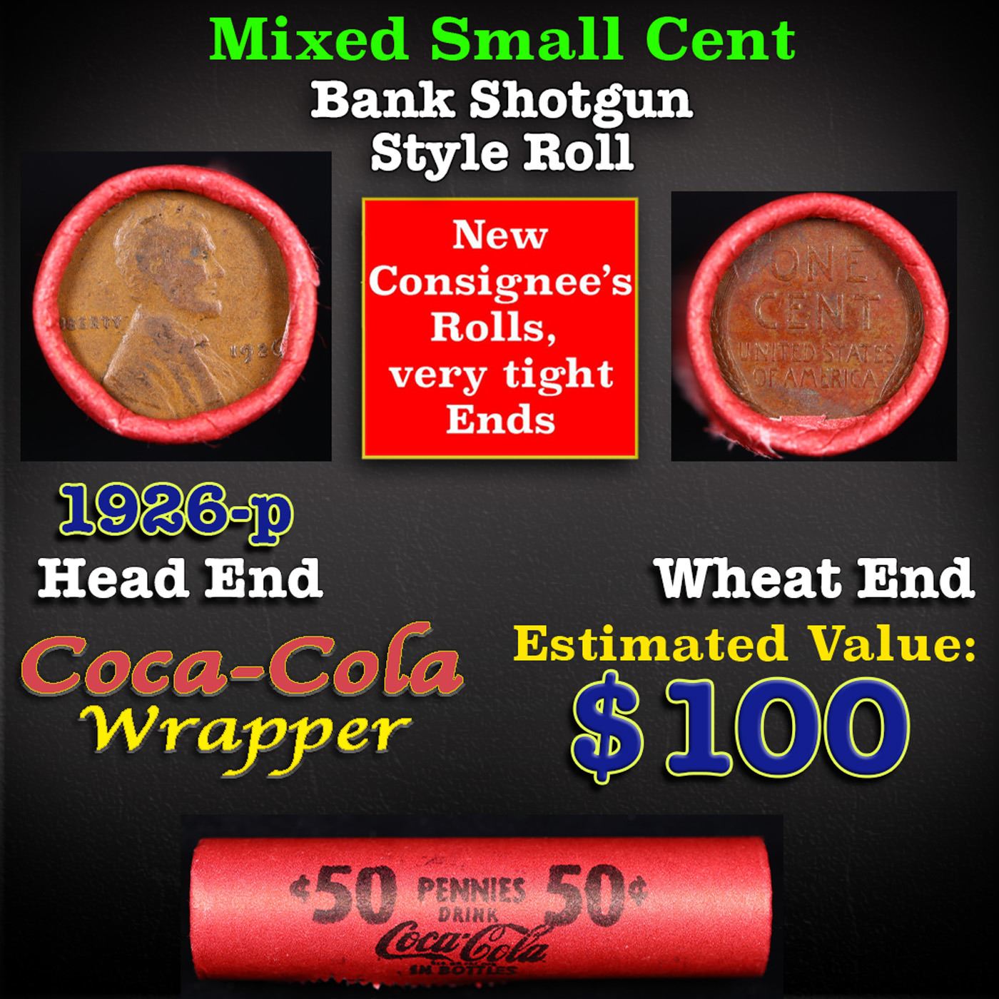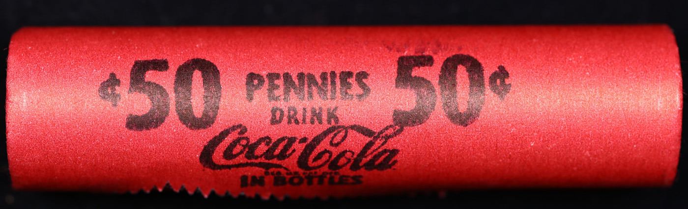 Mixed small cents 1c orig shotgun roll, 1926-p Lincoln Cent, Wheat Cent other end, Coca Cola Wrapper. Actual roll pictured is the roll you will get. A Brandt wrapper stamped Coca-Cola. A great original bank shotgun roll with very tight ends. We have opened a few of these rolls. They seem to be mixed small cents including Indians, Wheats, Steel cents & some Flying Eagles mixed in. These shotgun rolls are all from a new consignee. They are all frrom one Estate.