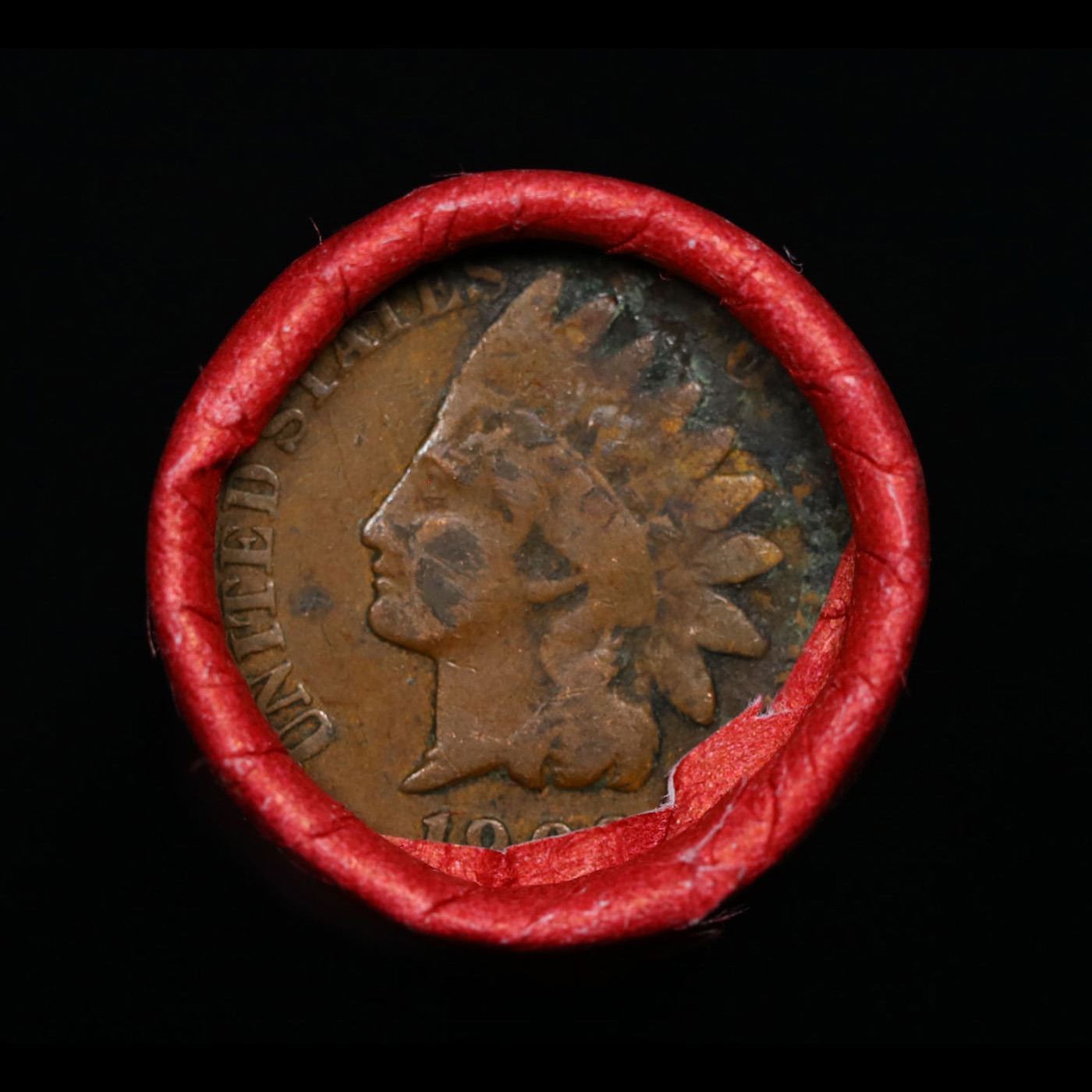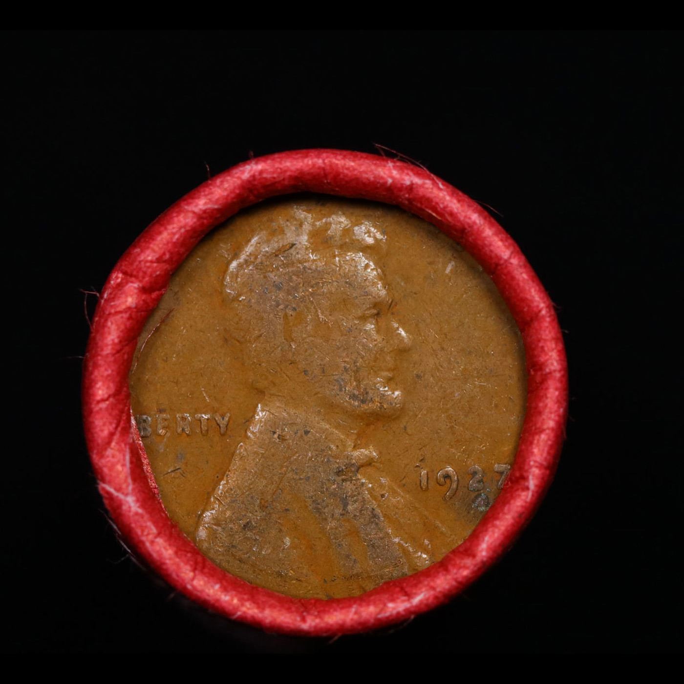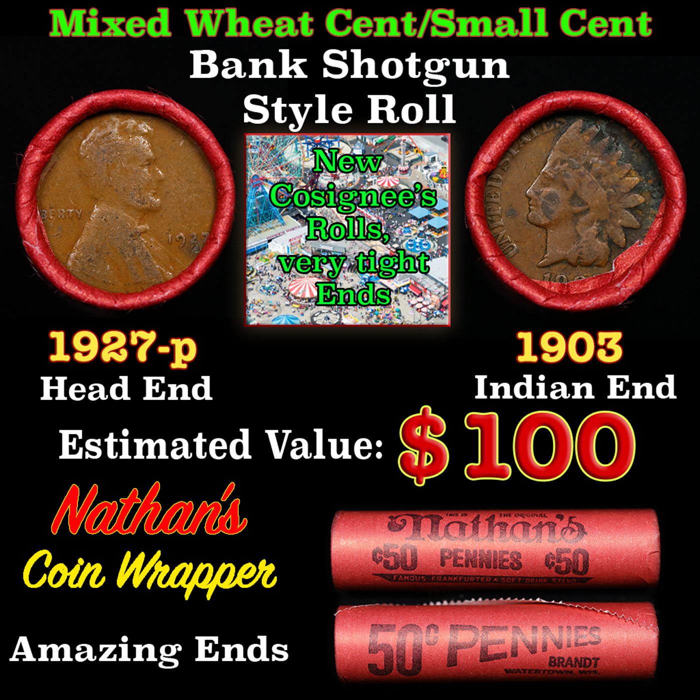 Mixed small cents 1c orig shotgun roll, 1927-p Lincoln Cent, 1903 Indian Cent other end, Nathan's Br
