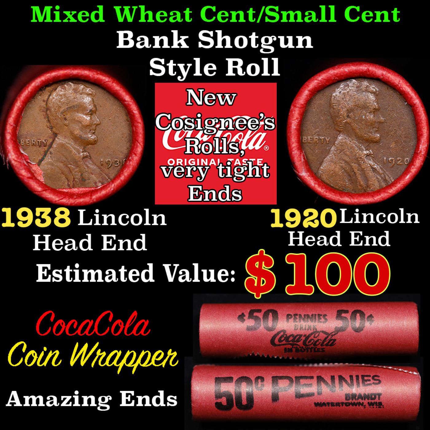 Mixed small cents 1c orig shotgun roll, 1929-p Lincoln Cent, 1938-p Lincoln Cent other end, Coca-Cola Brandt Wrapper.. The roll is held in an old Rare & Collectable Brinks 'Only Brinks Can Open This Safe, Chicago IL' Penny wrapper. Actual roll pictured is the roll you will get. A great original bank shotgun roll with very tight ends. We have opened a few of these rolls. They seem to be mixed small cents including Indians, Wheats, Steel cents & some Flying Eagles mixed in. These shotgun rolls are all from a new consignee. They are all frrom one Estate.