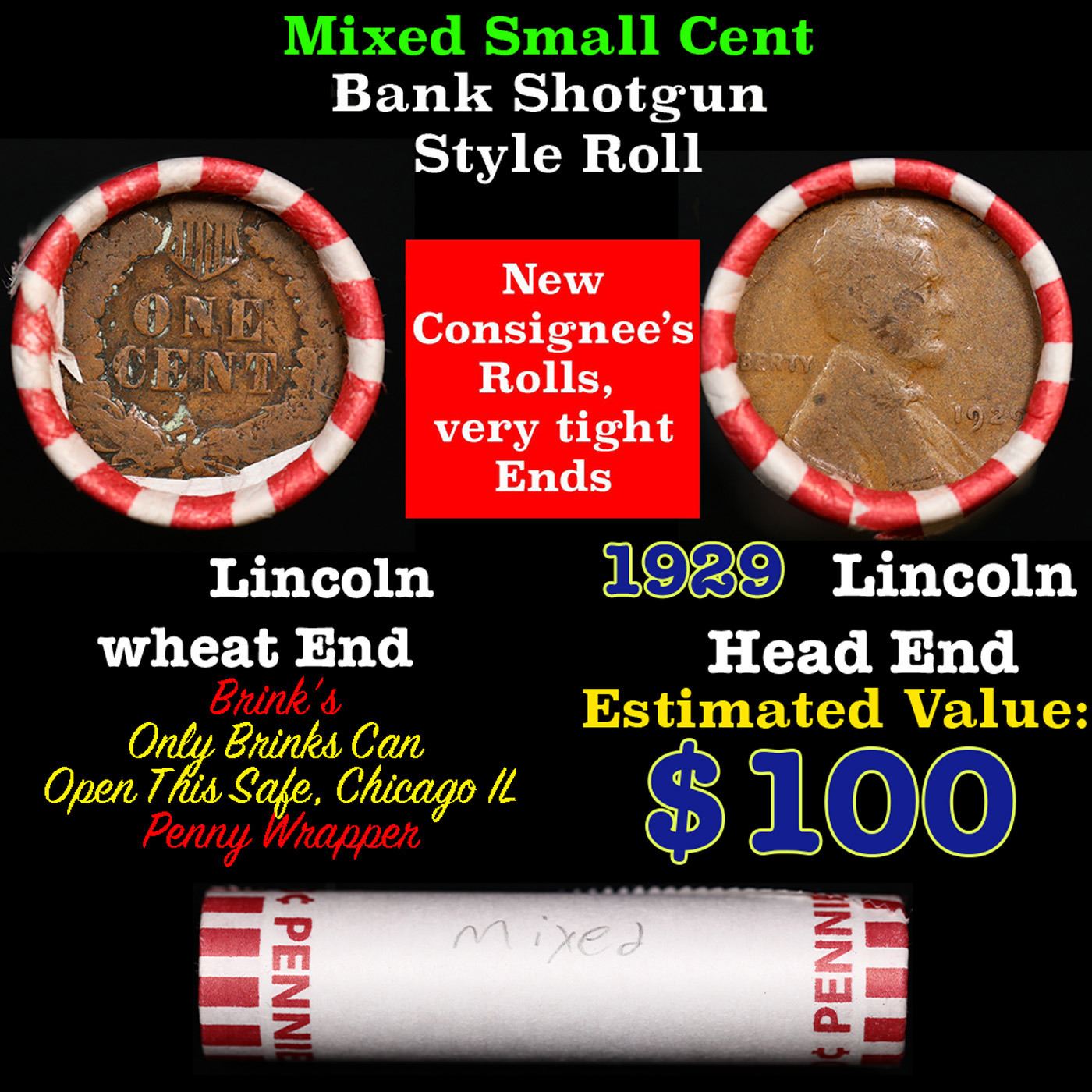 Mixed small cents 1c orig shotgun roll, 1929-p Lincoln Cent,Wheat Cent other end, Brinks Wrapper.. The roll is held in an old Rare & Collectable Brinks 'Only Brinks Can Open This Safe, Chicago IL' Penny wrapper. Actual roll pictured is the roll you will get. A great original bank shotgun roll with very tight ends. We have opened a few of these rolls. They seem to be mixed small cents including Indians, Wheats, Steel cents & some Flying Eagles mixed in. These shotgun rolls are all from a new consignee. They are all frrom one Estate.