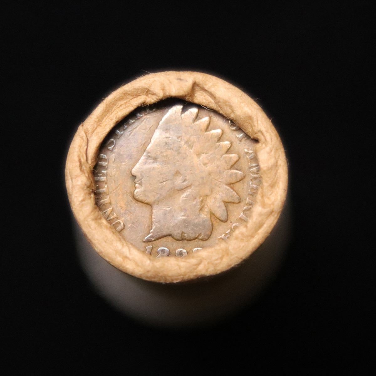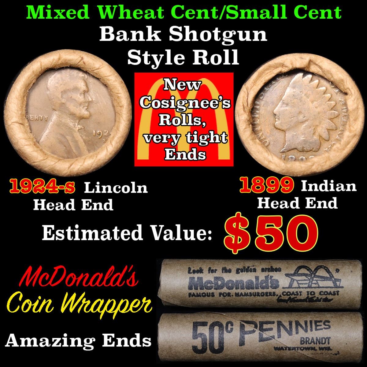 Mixed small cents 1c orig shotgun roll, 1929-s Wheat Cent, 1899 Indian Cent other end . .. The roll is held in an old Rare & Collectable McDonalds Brandt wrapper. Actual roll pictured is the roll you will get. A great original bank shotgun roll with very tight ends. We have opened a few of these rolls. They seem to be mixed small cents including Indians, Wheats, Steel cents & some Flying Eagles mixed in. These shotgun rolls are all from a new consignee. They are all frrom one Estate.