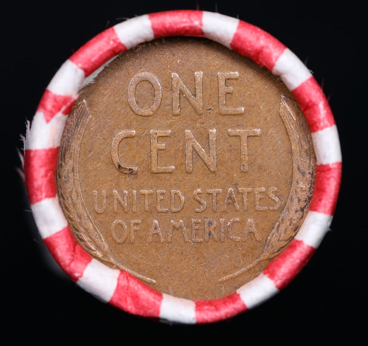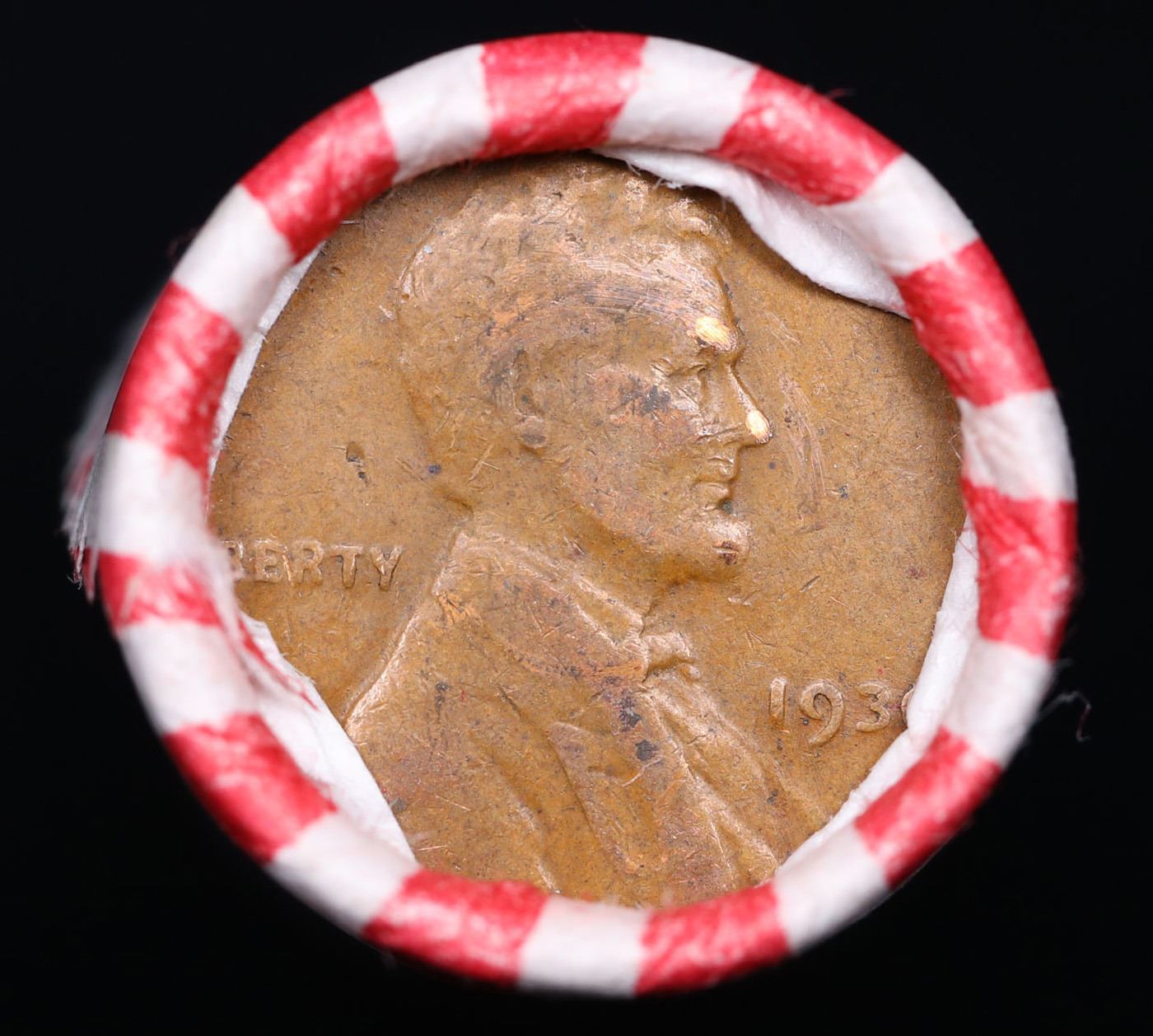 Mixed small cents 1c orig shotgun roll, 1930-p Lincoln Cent, Wheat Cent other end, Bank Wrapper.