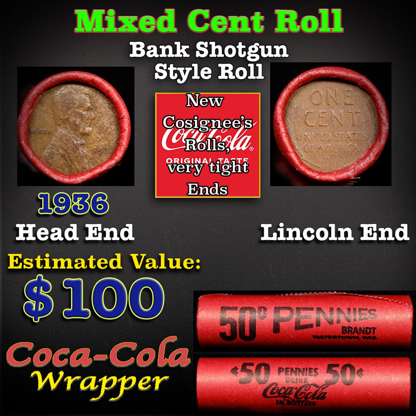 Mixed small cents 1c orig shotgun roll, 1930-p Lincoln Cent, Wheat Cent other end, Coca-Cola Brandt Wrapper..        The roll is held in an old Rare & Collectable Brinks 'Only Brinks Can Open This Safe, Chicago IL' Penny  wrapper. Actual roll pictured is the roll you will get. A great original bank shotgun roll with very tight ends. We have opened a few of these rolls. They seem to be mixed small cents including Indians, Wheats, Steel cents & some Flying Eagles mixed in. These shotgun rolls are all from a new consignee. They are all frrom one Estate.