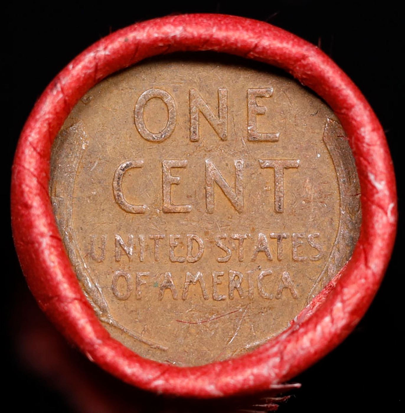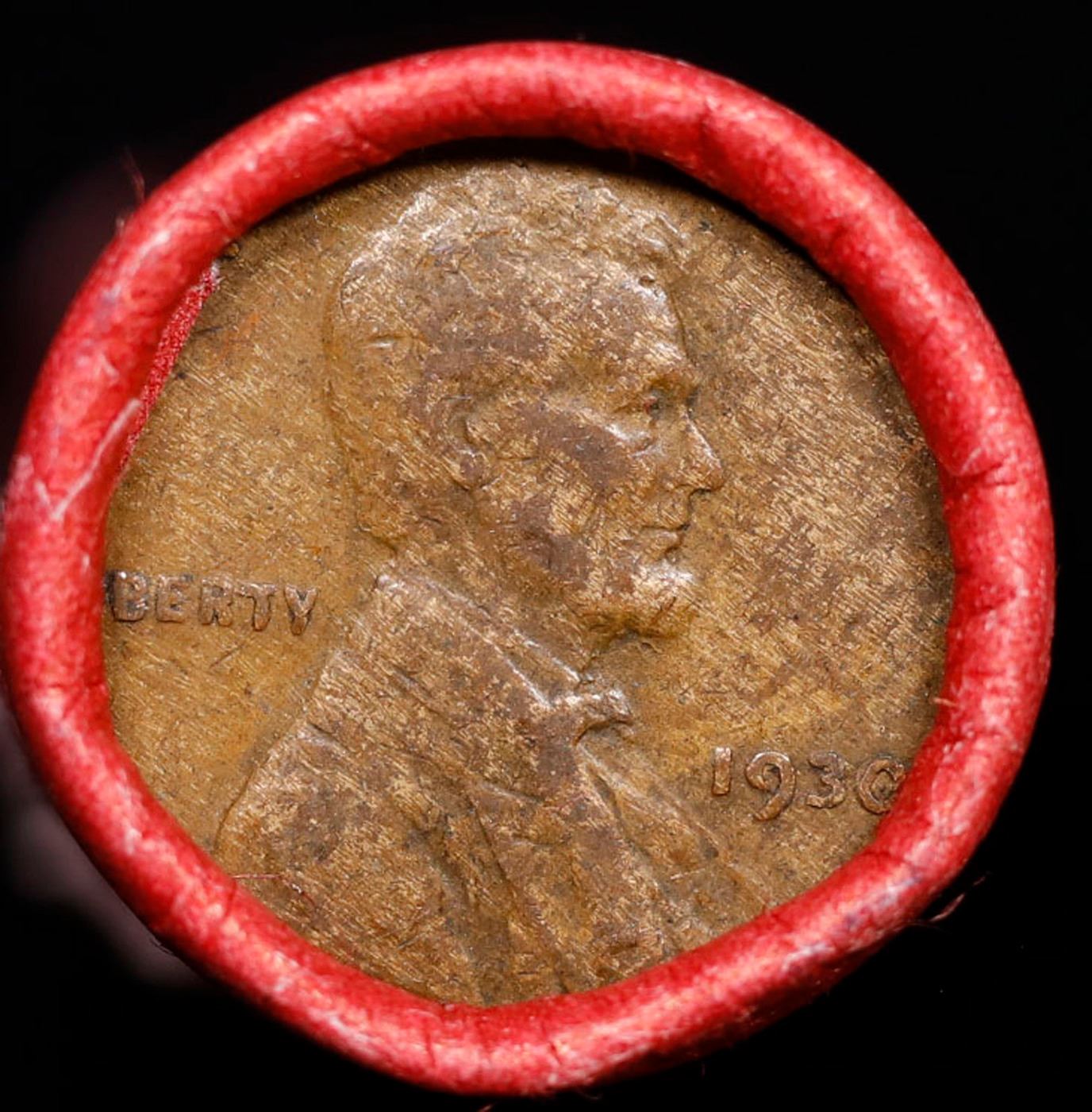 Mixed small cents 1c orig shotgun roll, 1930-p Lincoln Cent, Wheat Cent other end, Coca-Cola Brandt