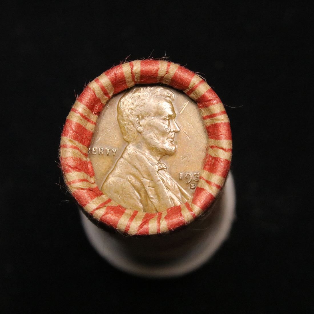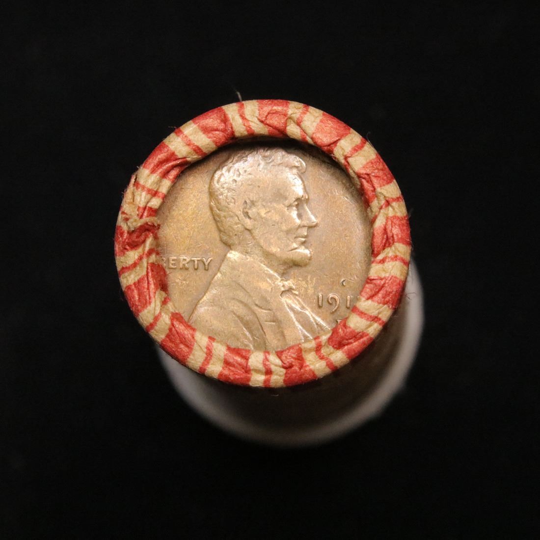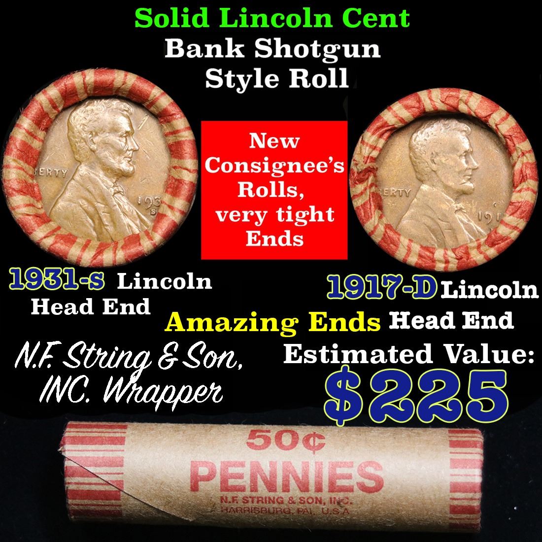 . The roll is held in an old Seal Strong wrapper. Actual roll pictured is the roll you will get. A great original bank shotgun roll with very tight ends. We have been getting excellent feedback on these rolls. Were being told that close to half the roll are teens, some with mintmarks, there are a few Indians in all the rolls, most of the rolls have steel cents. They seem to be PQ Wheaties rolls. These shotgun rolls are all from a new consignee. They are all frrom one Estate.
