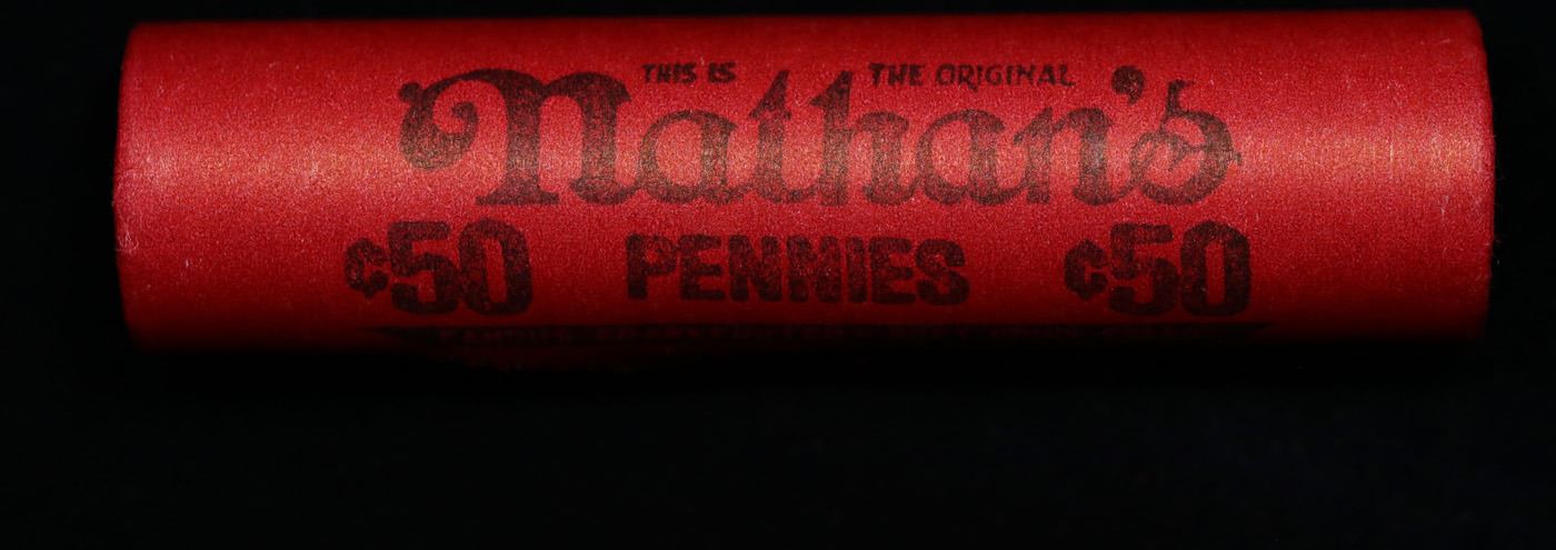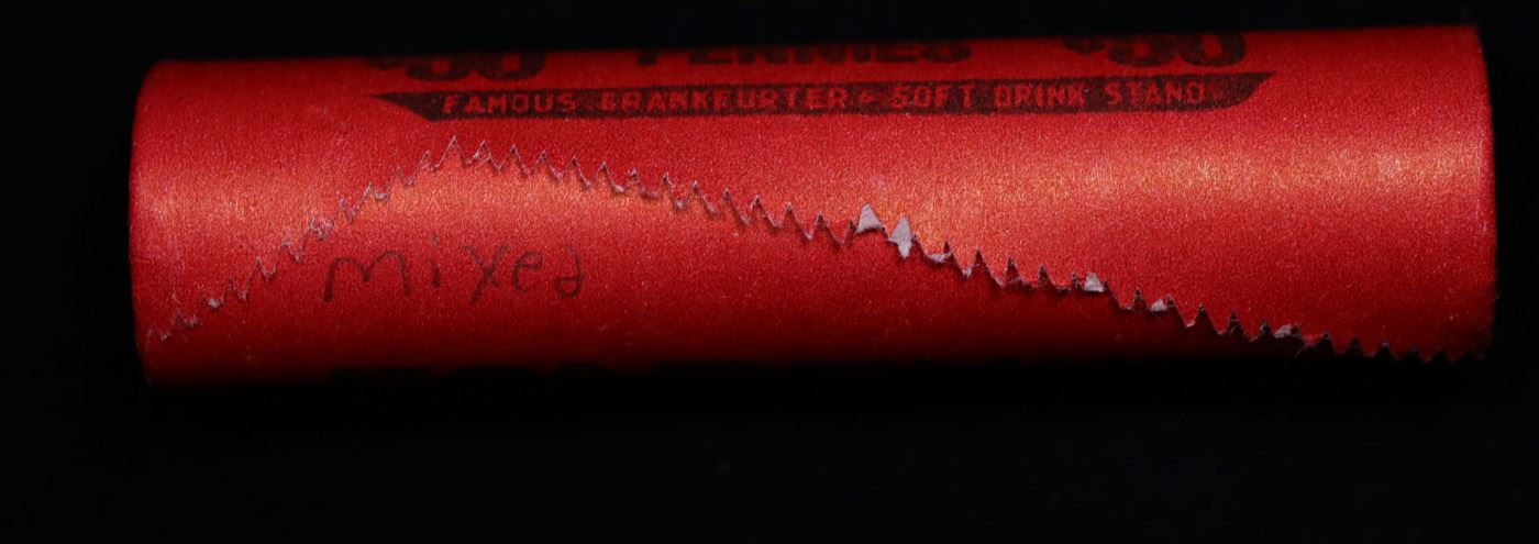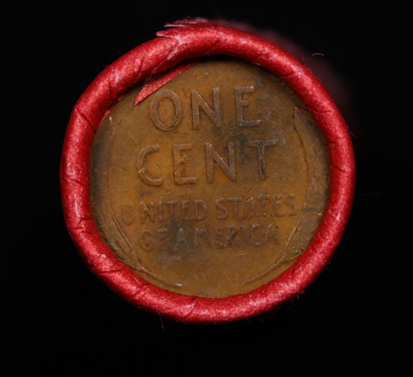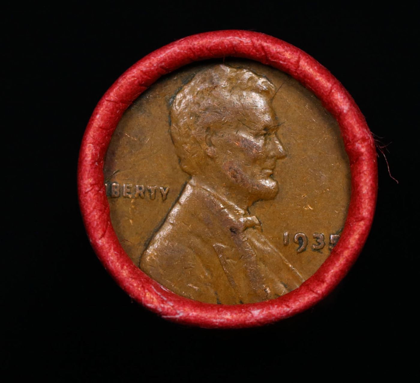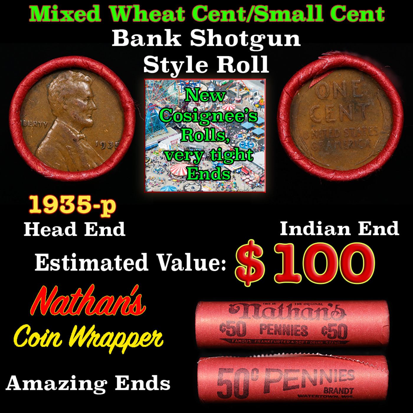 Mixed small cents 1c orig shotgun roll, 1935-p Lincoln Cent, Wheat Cent other end, Nathan's Brandt W
