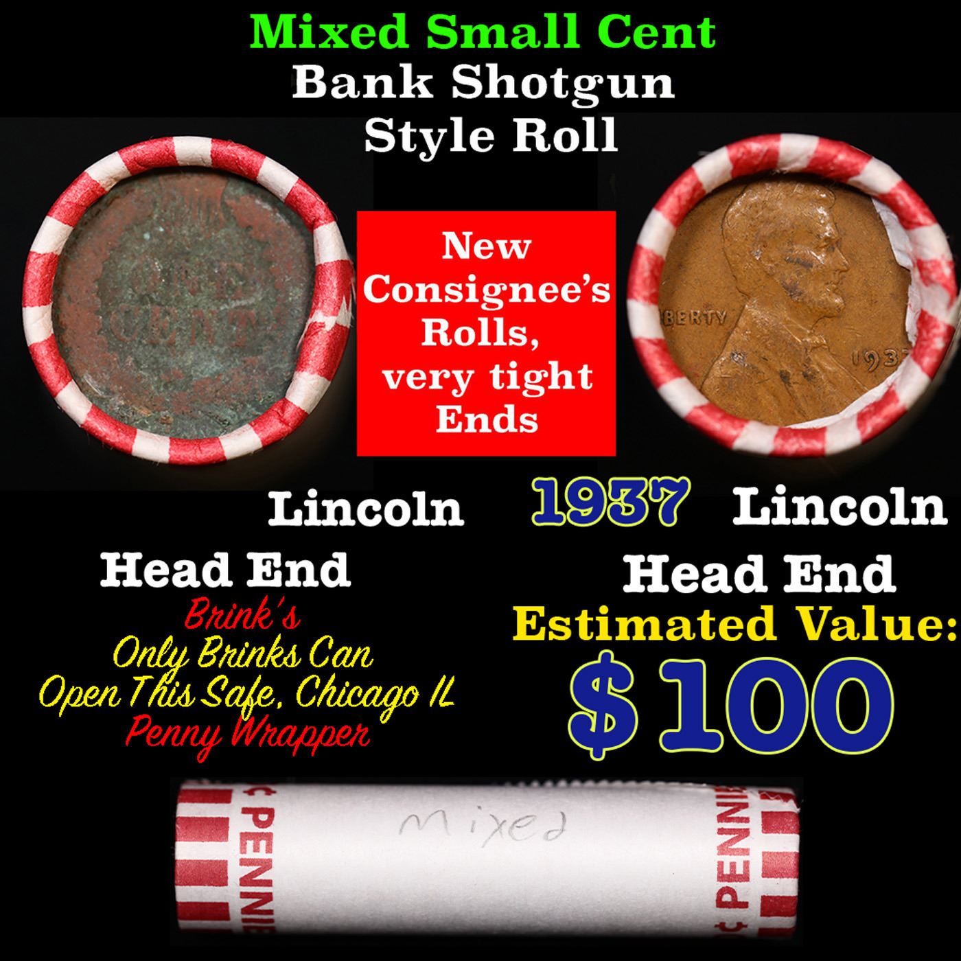 Mixed small cents 1c orig shotgun roll, 1937-p Lincoln Cent,Wheat Cent other end, Brinks Wrapper.. The roll is held in an old Rare & Collectable Brinks 'Only Brinks Can Open This Safe, Chicago IL' Penny wrapper. Actual roll pictured is the roll you will get. A great original bank shotgun roll with very tight ends. We have opened a few of these rolls. They seem to be mixed small cents including Indians, Wheats, Steel cents & some Flying Eagles mixed in. These shotgun rolls are all from a new consignee. They are all frrom one Estate.