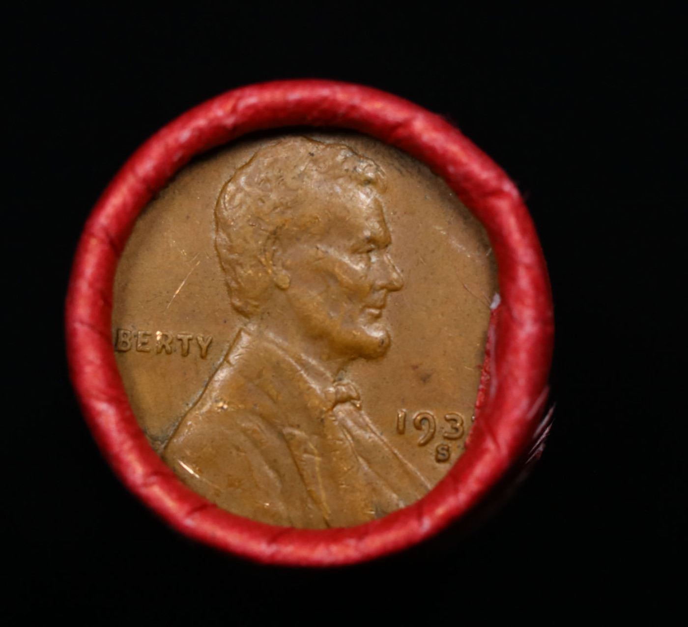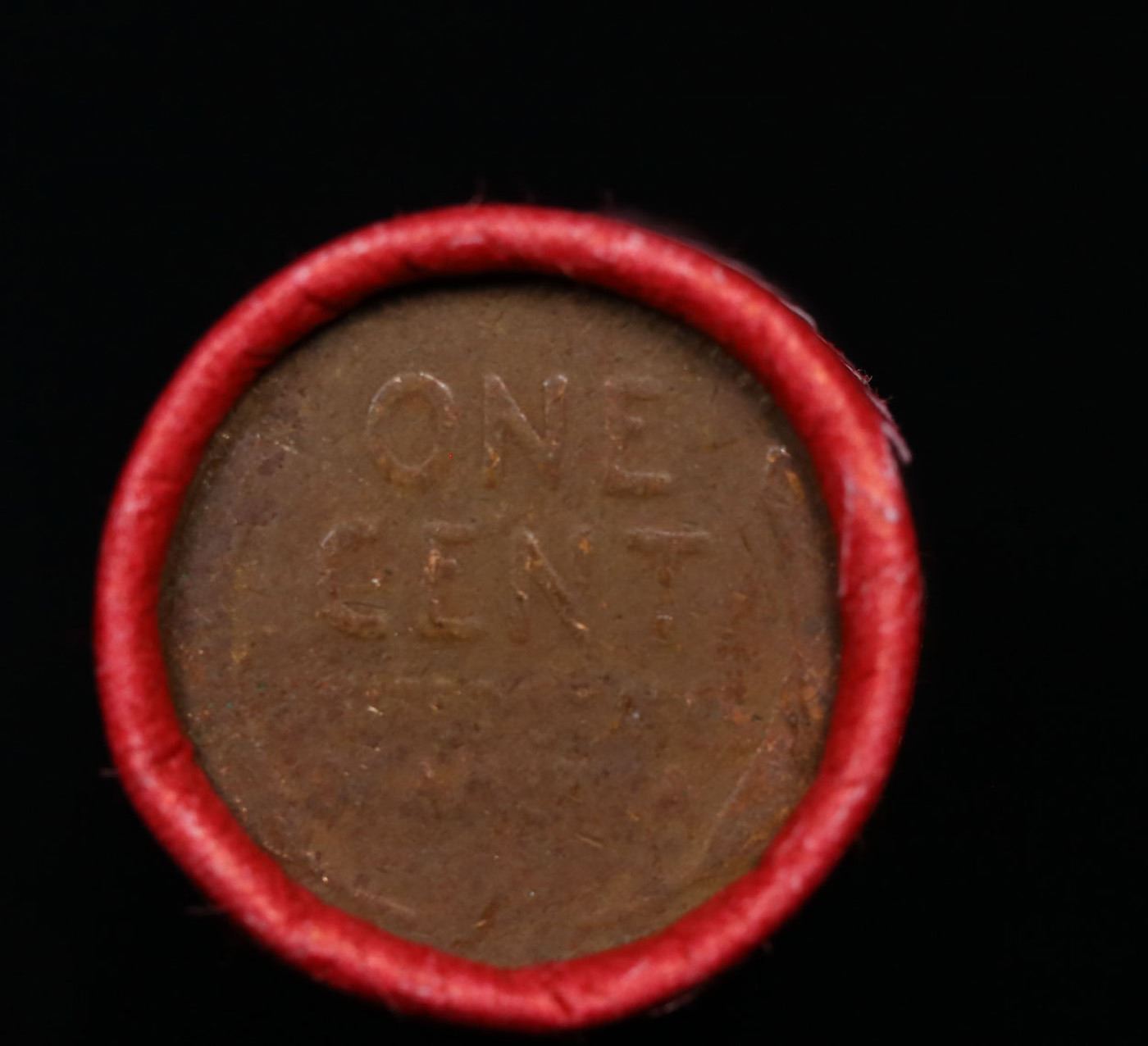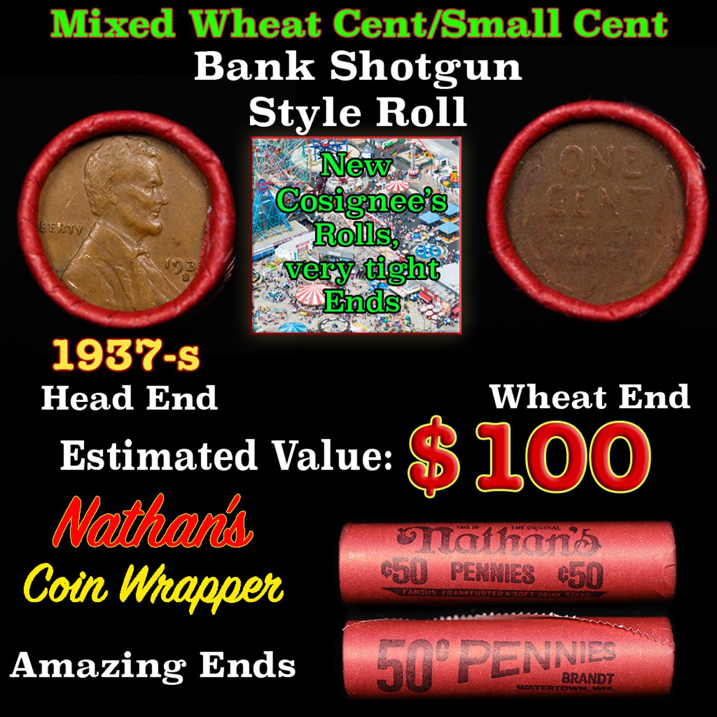 Mixed small cents 1c orig shotgun roll, 1937-s Lincoln Cent, Wheat Cent other end, Nathan's Brandt W