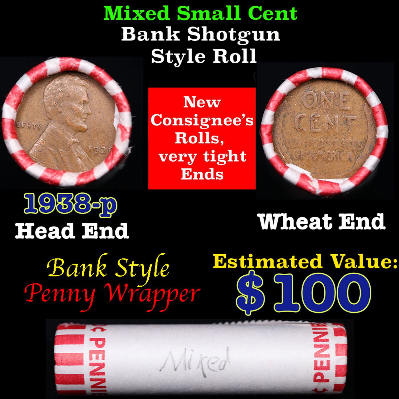 Mixed small cents 1c orig shotgun roll, 1938-p Lincoln Cent, Wheat Cent other end, Bank Wrapper.. Actual roll pictured is the roll you will get. A great original bank shotgun roll with very tight ends. We have opened a few of these rolls. They seem to be mixed small cents including Indians, Wheats, Steel cents & some Flying Eagles mixed in. These shotgun rolls are all from a new consignee. They are all frrom one Estate.