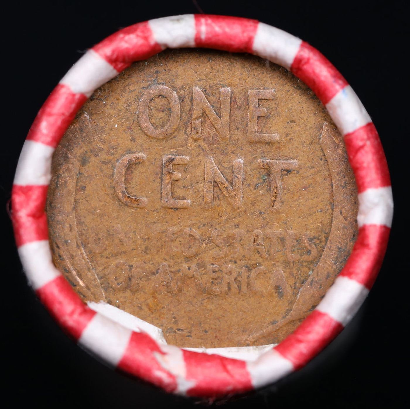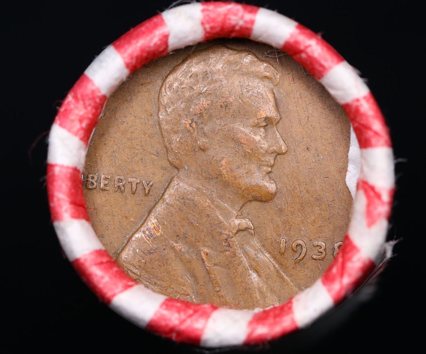 Mixed small cents 1c orig shotgun roll, 1938-p Lincoln Cent, Wheat Cent other end, Bank Wrapper.