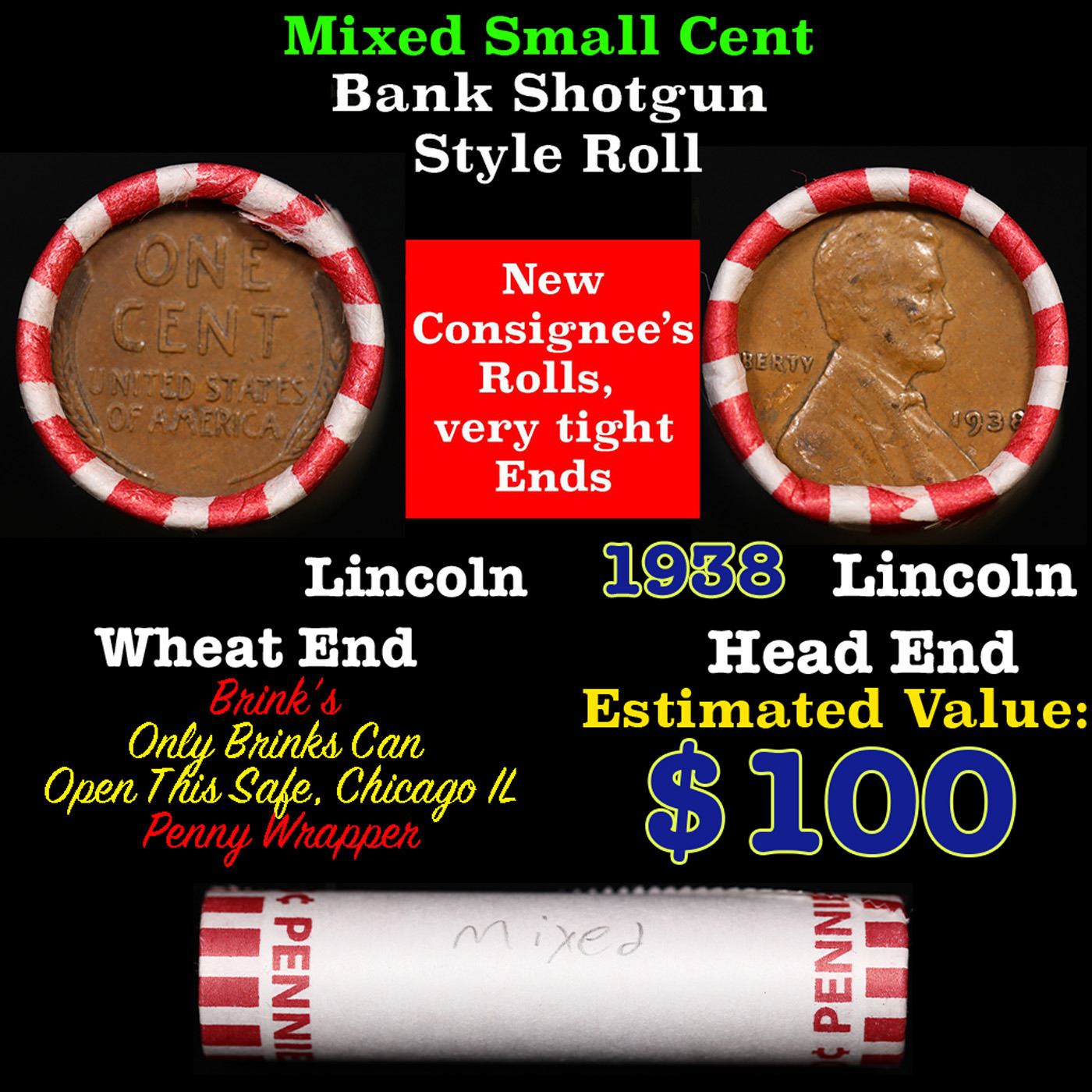 Mixed small cents 1c orig shotgun roll, 1938-p Lincoln Cent, Wheat Cent other end, Brinks Wrapper.. The roll is held in an old Rare & Collectable Brinks 'Only Brinks Can Open This Safe, Chicago IL' Penny wrapper. Actual roll pictured is the roll you will get. A great original bank shotgun roll with very tight ends. We have opened a few of these rolls. They seem to be mixed small cents including Indians, Wheats, Steel cents & some Flying Eagles mixed in. These shotgun rolls are all from a new consignee. They are all frrom one Estate.