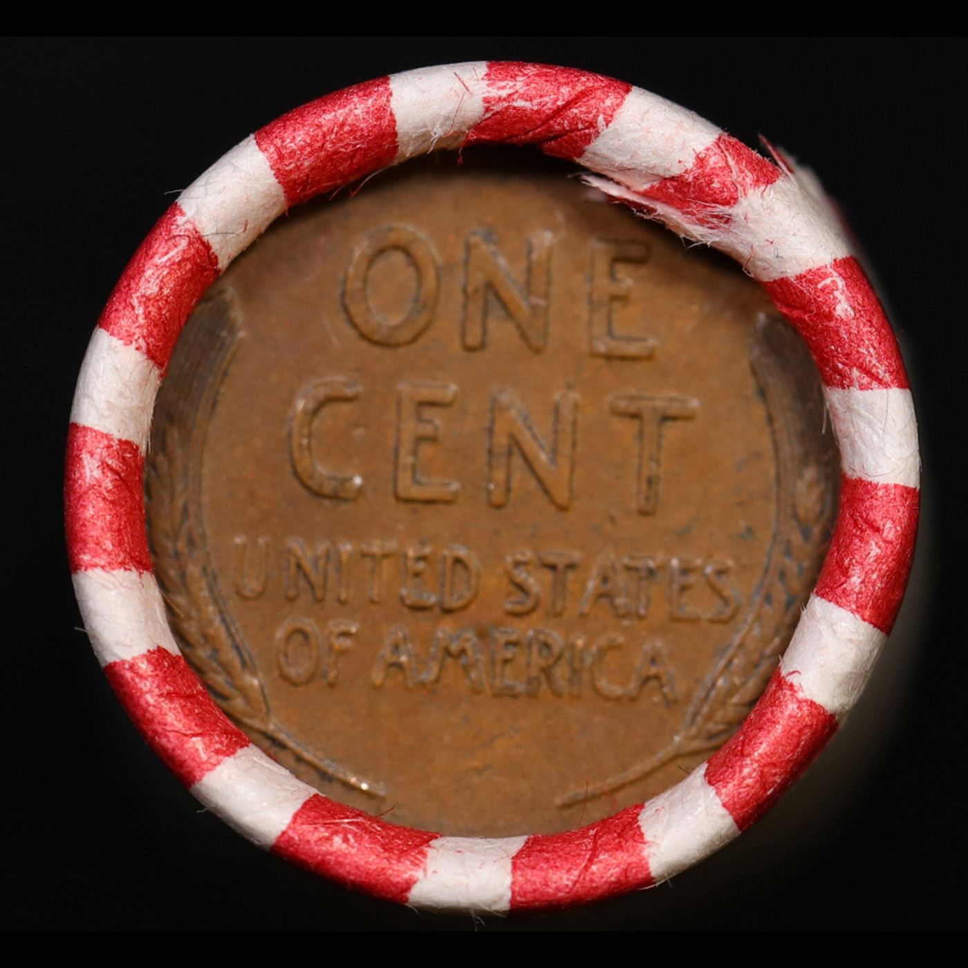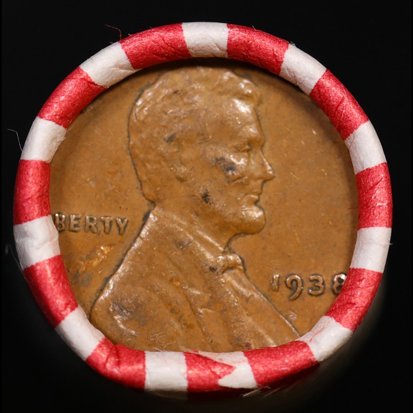 Mixed small cents 1c orig shotgun roll, 1938-p Lincoln Cent, Wheat Cent other end, Brinks Wrapper.