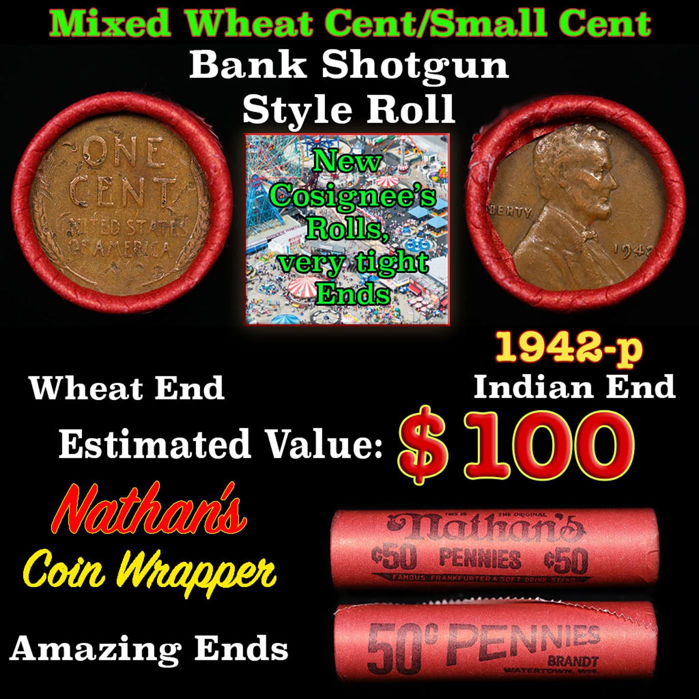 Mixed small cents 1c orig shotgun roll, 1942-p Lincoln Cent, Wheat Cent other end, Nathan's Brandt Wrapper.. The roll is held in an old Rare & Collectable Brinks 'Only Brinks Can Open This Safe, Chicago IL' Penny wrapper. Actual roll pictured is the roll you will get. A great original bank shotgun roll with very tight ends. We have opened a few of these rolls. They seem to be mixed small cents including Indians, Wheats, Steel cents & some Flying Eagles mixed in. These shotgun rolls are all from a new consignee. They are all frrom one Estate.