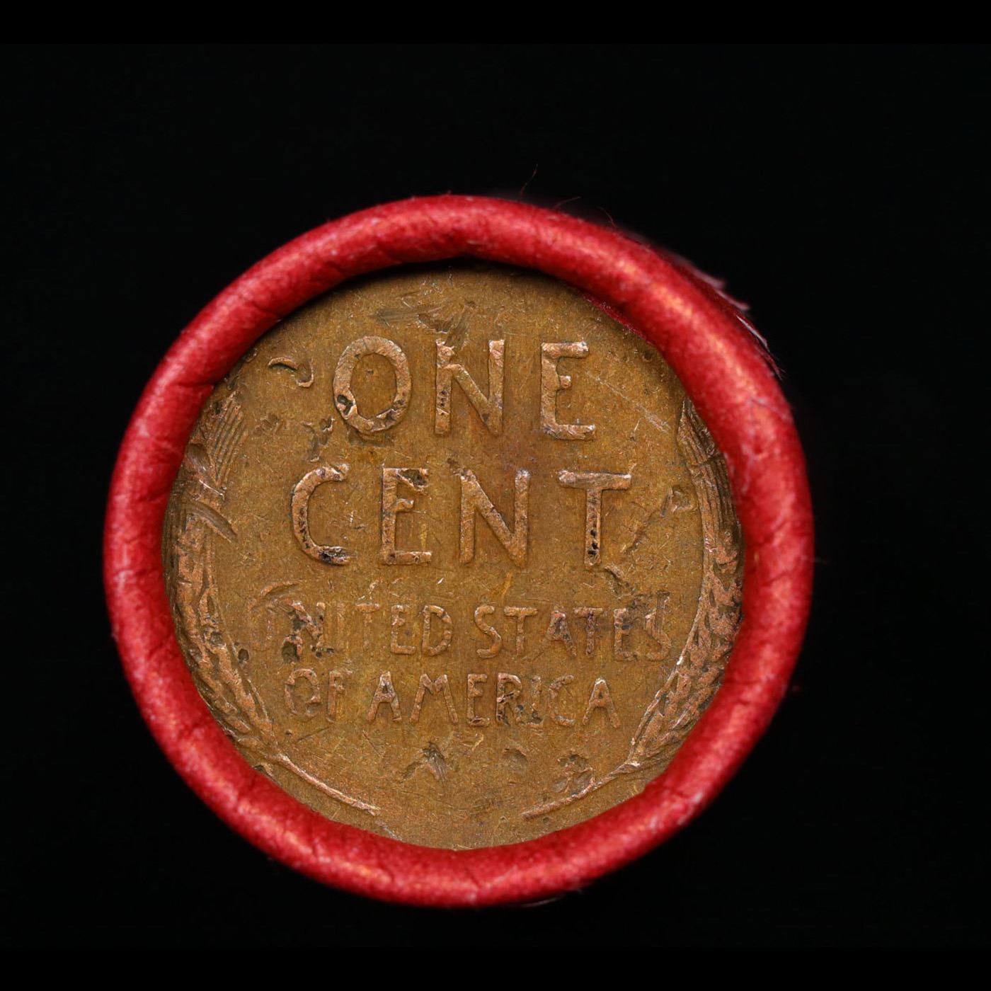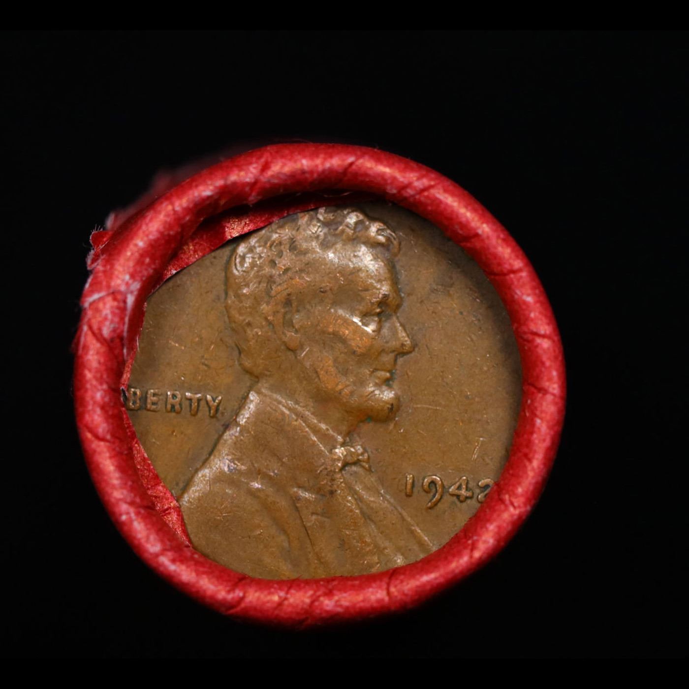 Mixed small cents 1c orig shotgun roll, 1942-p Lincoln Cent, Wheat Cent other end, Nathan's Brandt W