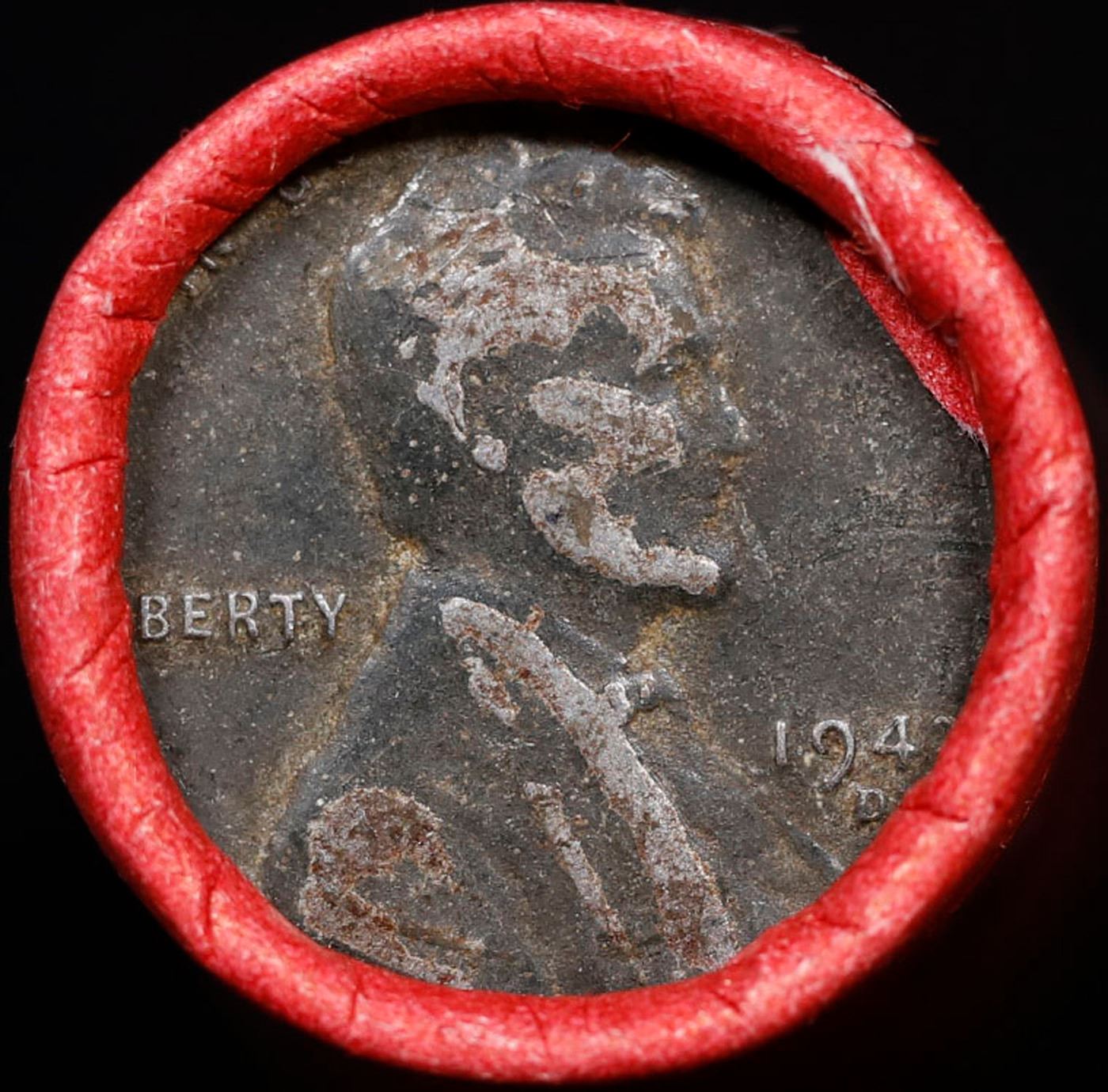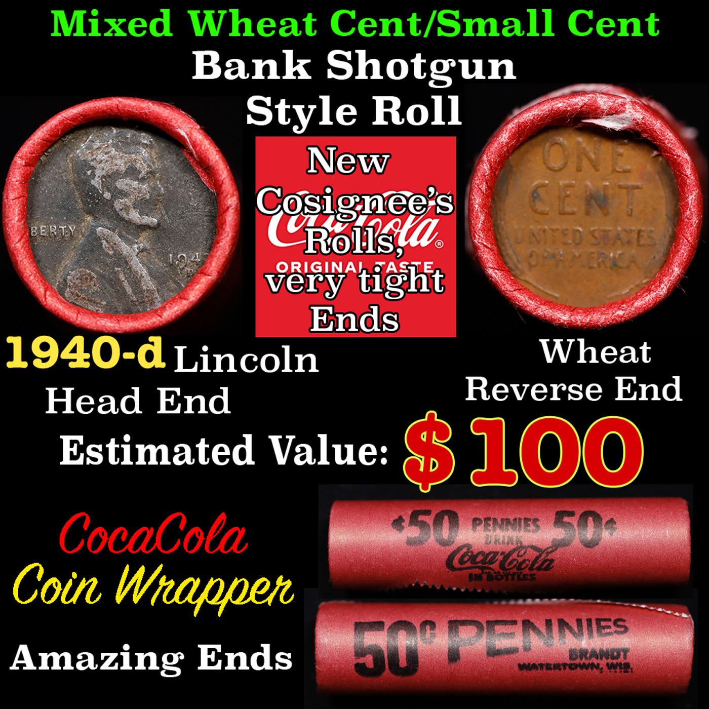 Mixed small cents 1c orig shotgun roll, 1943-d Steel Cent, Wheat Cent other end, Coca Cola Wrapper.