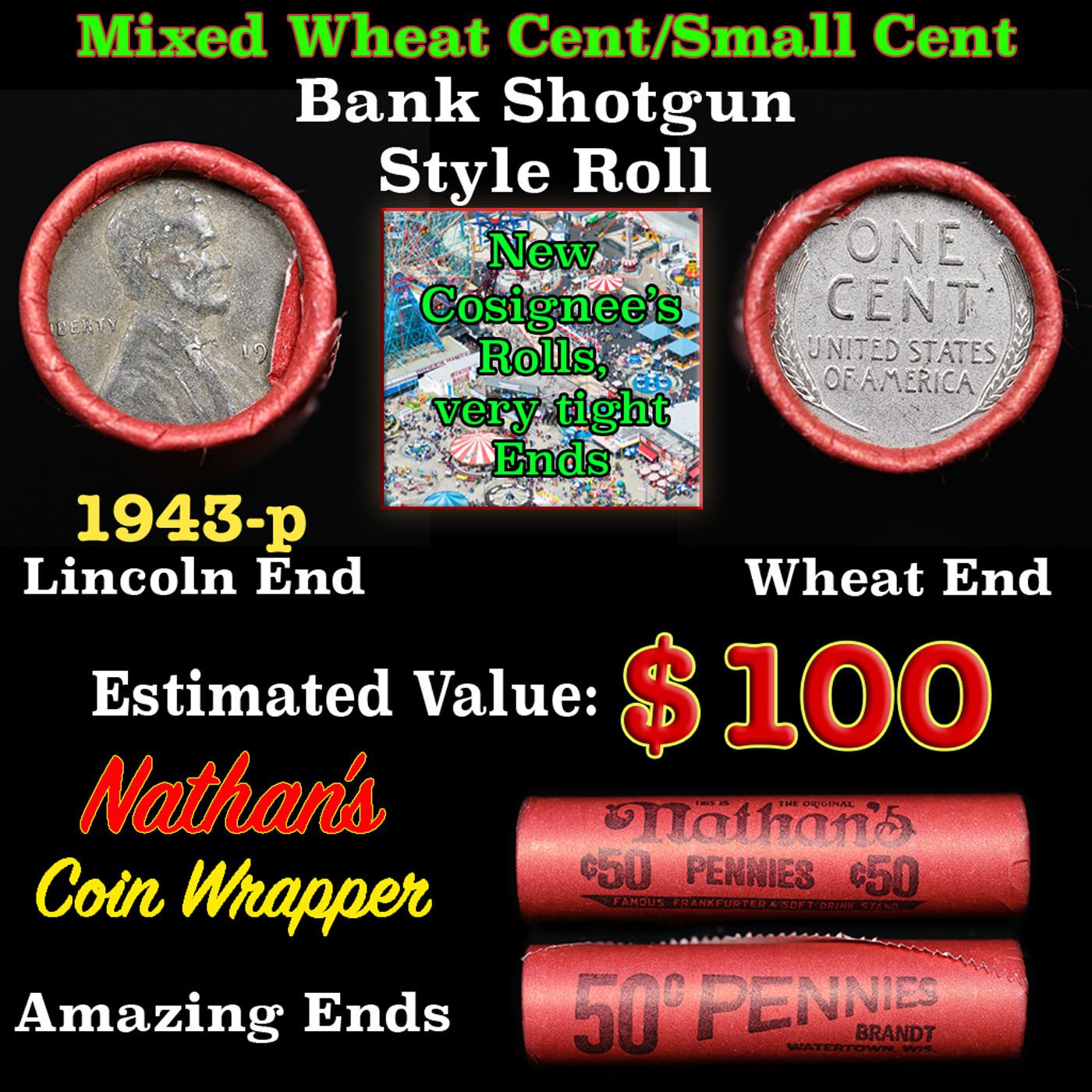Mixed small cents 1c orig shotgun roll, 1943-p Lincoln Cent, Wheat Cent other end, Nathan's Brandt Wrapper.. The roll is held in an old Rare & Collectable Brinks 'Only Brinks Can Open This Safe, Chicago IL' Penny wrapper. Actual roll pictured is the roll you will get. A great original bank shotgun roll with very tight ends. We have opened a few of these rolls. They seem to be mixed small cents including Indians, Wheats, Steel cents & some Flying Eagles mixed in. These shotgun rolls are all from a new consignee. They are all frrom one Estate.
