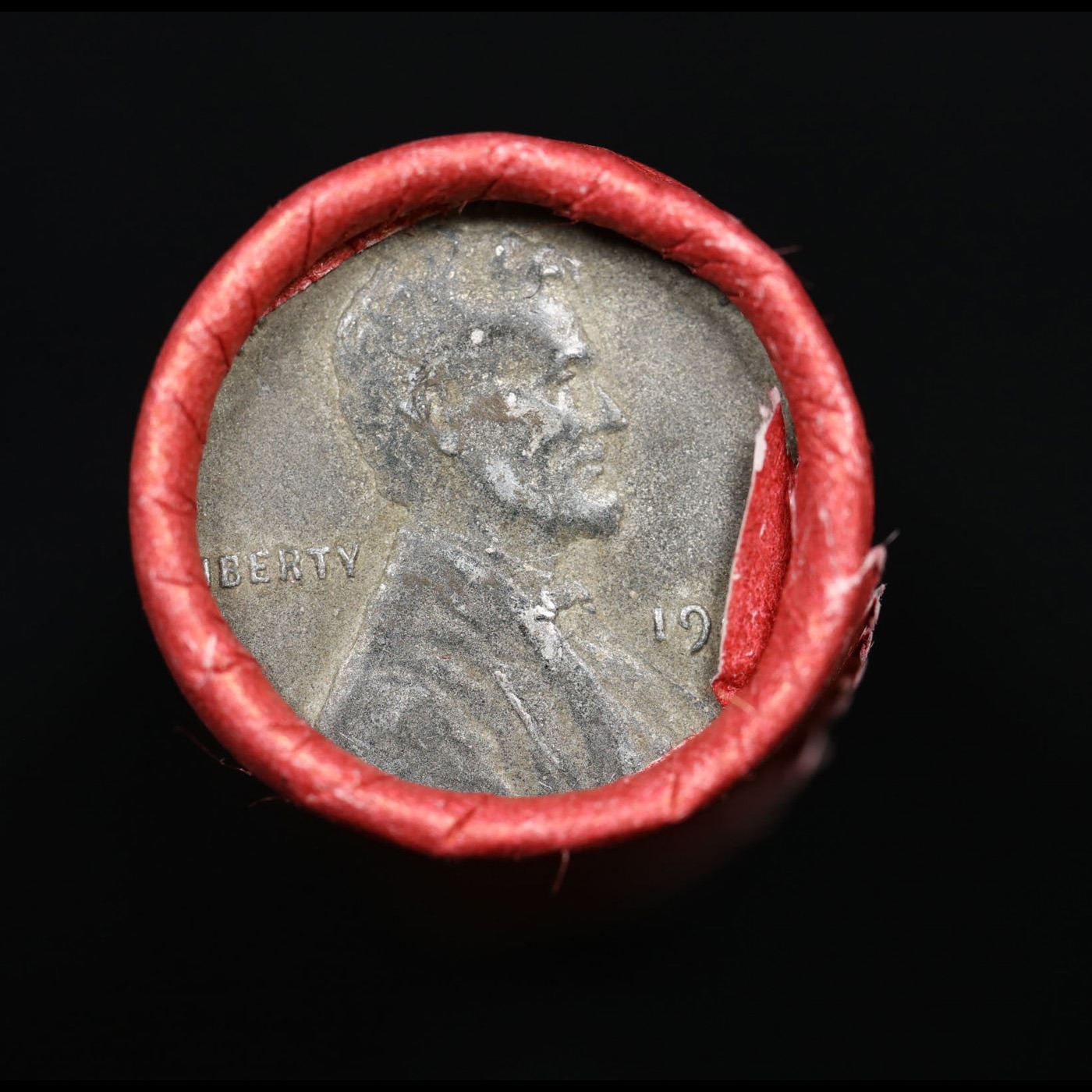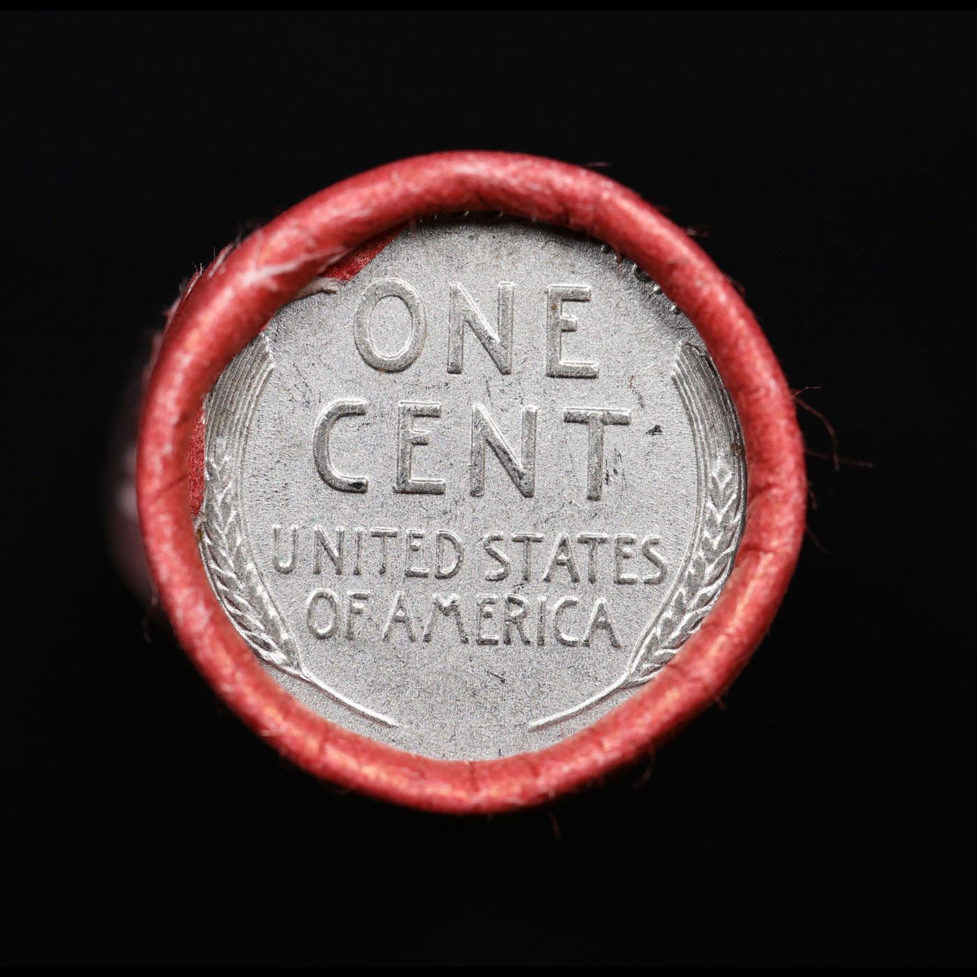 Mixed small cents 1c orig shotgun roll, 1943-p Lincoln Cent, Wheat Cent other end, Nathan's Brandt W