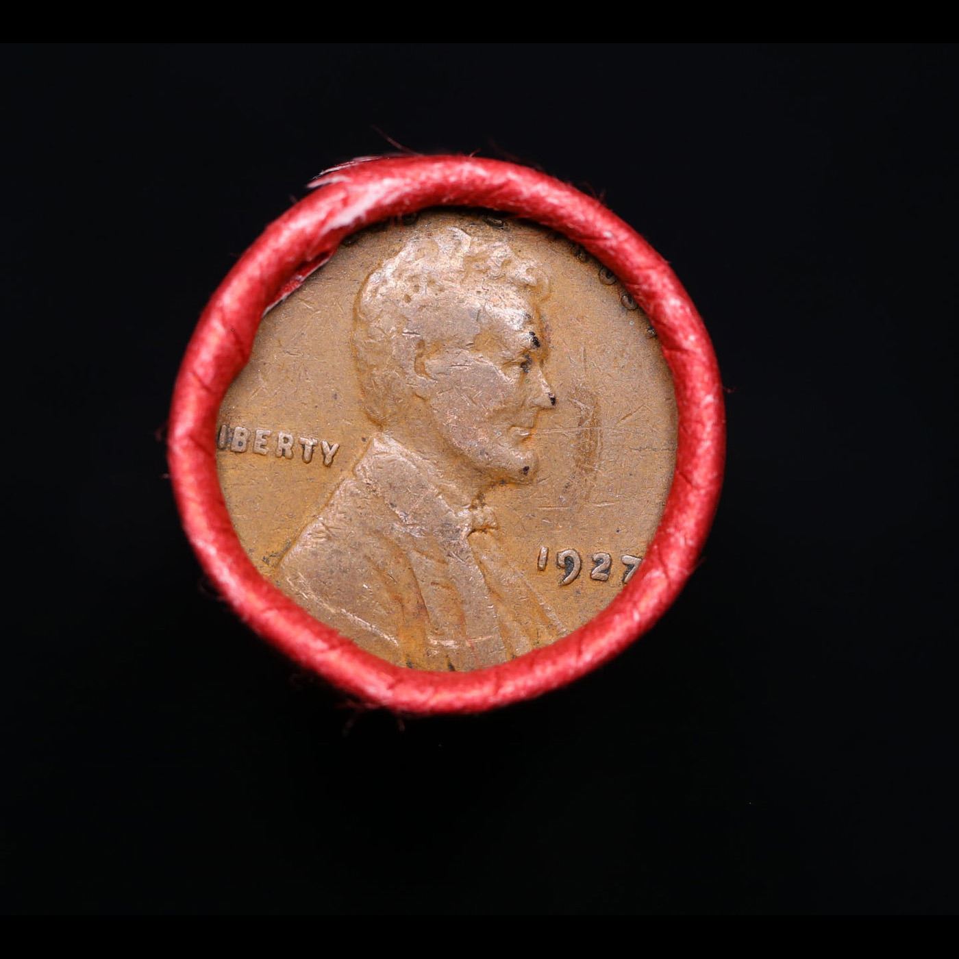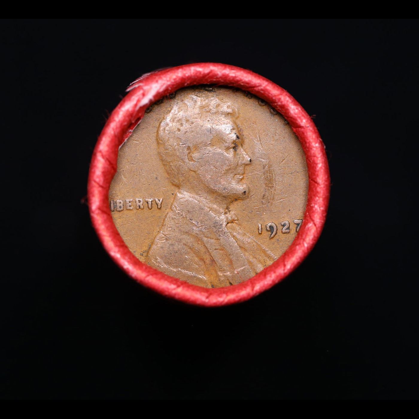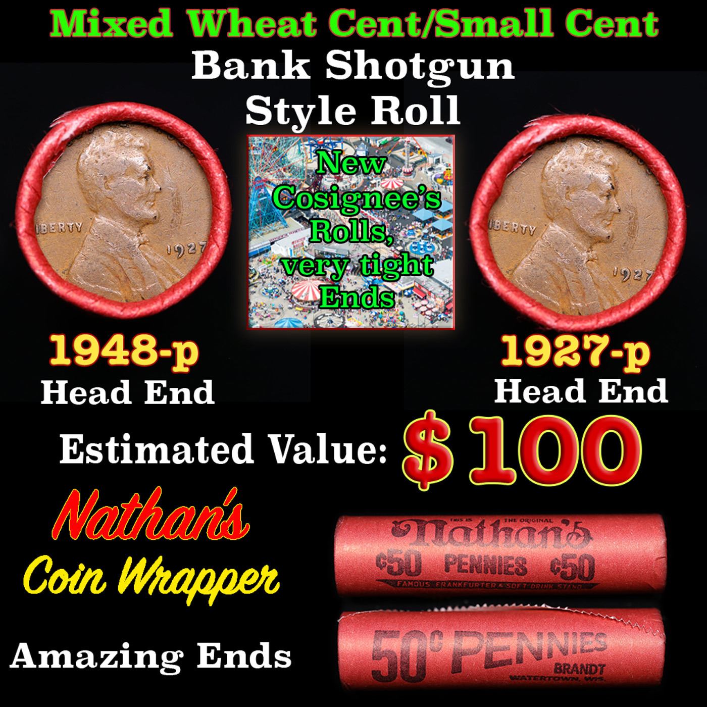 Mixed small cents 1c orig shotgun roll, 1948-p Lincoln Cent, 1927-p Lincoln Cent other end, Nathan's