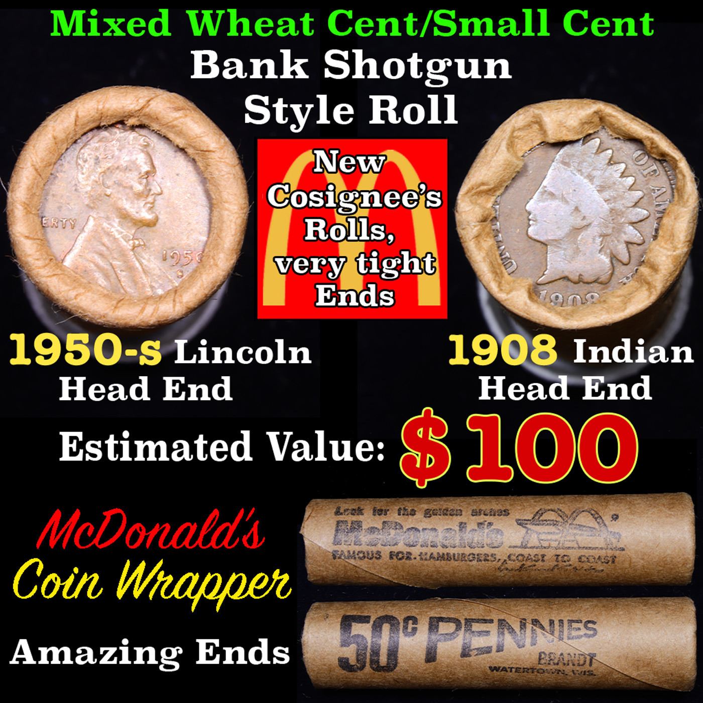 Mixed small cents 1c orig shotgun roll, 1950-s Wheat Cent, 1908 Indian cent other end, McDonalds Wrapper Grades. The roll is held in an old Rare & Collectable McDonalds Wrapper. Look for the Golden Arches. Actual roll pictured is the roll you will get. A great original bank shotgun roll with very tight ends. We have opened a few of these rolls. They seem to be mixed small cents including Indians, Wheats, Steel cents & some Flying Eagles mixed in. These shotgun rolls are all from a new consignee. They are all frrom one Estate.