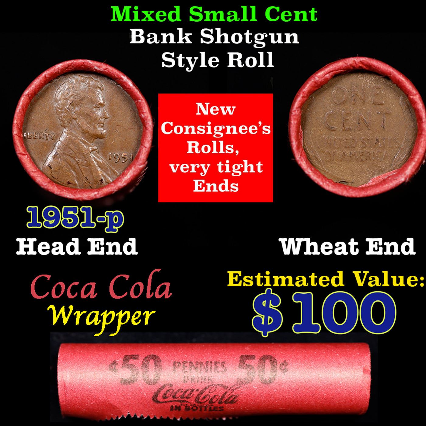 Mixed small cents 1c orig shotgun roll, 1951-p Lincoln Cent, Wheat Cent other end, Coca Cola Brandt Wrapper.. The roll is held in an old Rare & Collectable Brinks 'Only Brinks Can Open This Safe, Chicago IL' Penny wrapper. Actual roll pictured is the roll you will get. A great original bank shotgun roll with very tight ends. We have opened a few of these rolls. They seem to be mixed small cents including Indians, Wheats, Steel cents & some Flying Eagles mixed in. These shotgun rolls are all from a new consignee. They are all frrom one Estate.