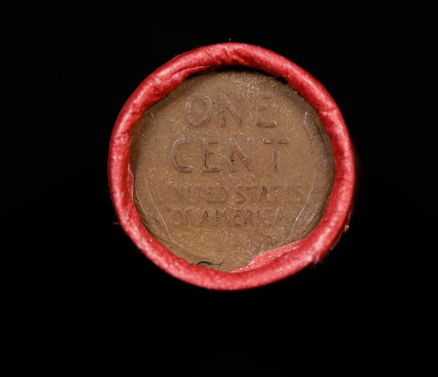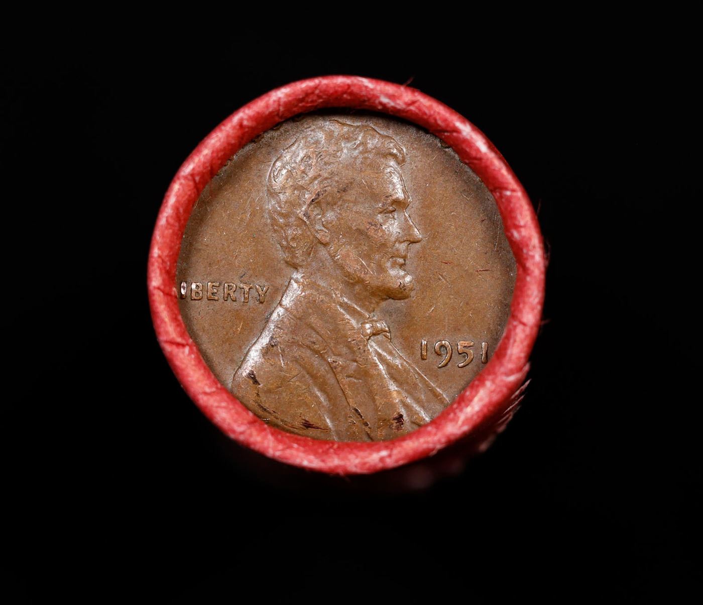Mixed small cents 1c orig shotgun roll, 1951-p Lincoln Cent, Wheat Cent other end, Coca Cola Brandt