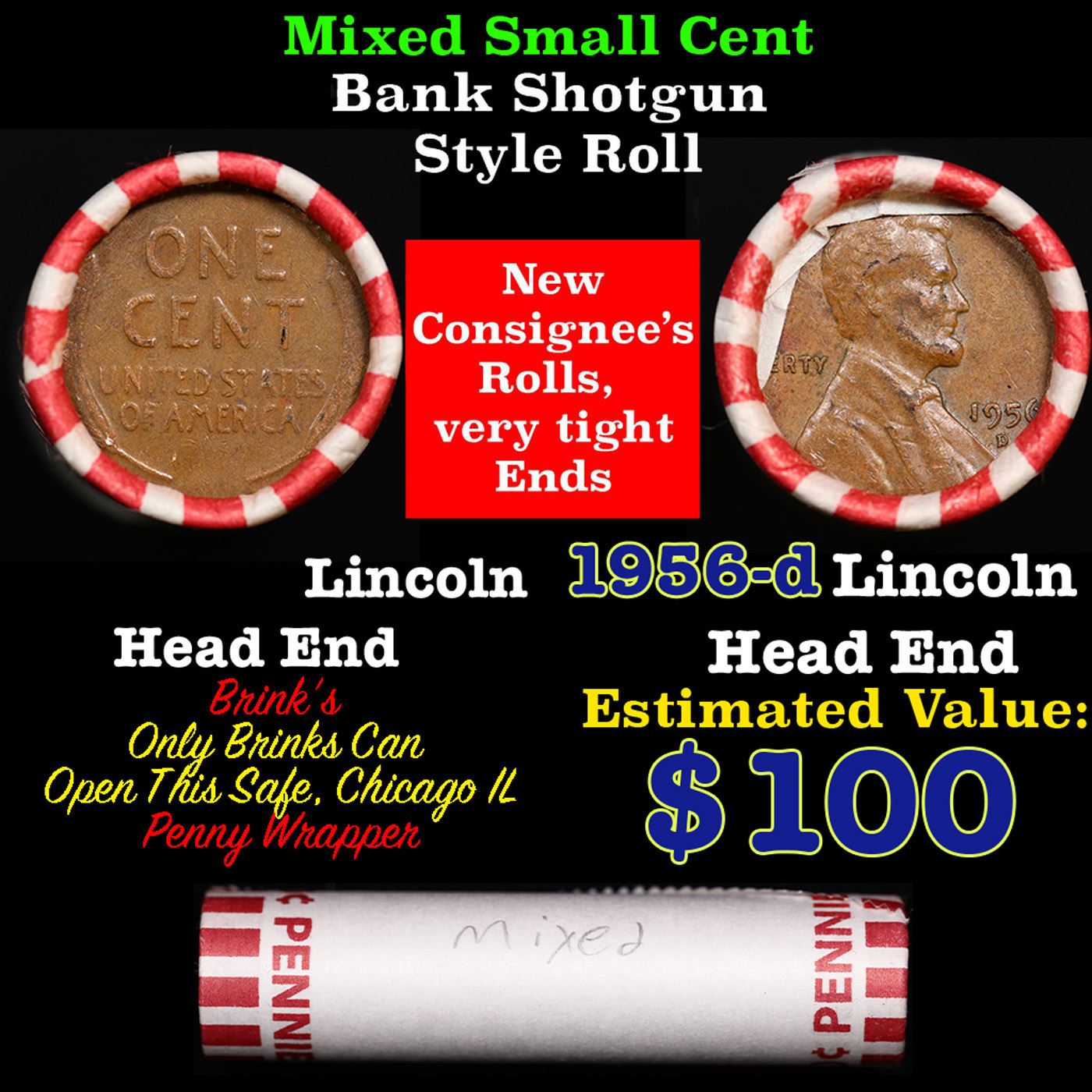 Mixed small cents 1c orig shotgun roll, 1956-d Wheat Cent, Wheat Cent other end, Brinks Wrapper.. The roll is held in an old Rare & Collectable Brinks 'Only Brinks Can Open This Safe, Chicago IL' Penny wrapper. Actual roll pictured is the roll you will get. A great original bank shotgun roll with very tight ends. We have opened a few of these rolls. They seem to be mixed small cents including Indians, Wheats, Steel cents & some Flying Eagles mixed in. These shotgun rolls are all from a new consignee. They are all frrom one Estate.