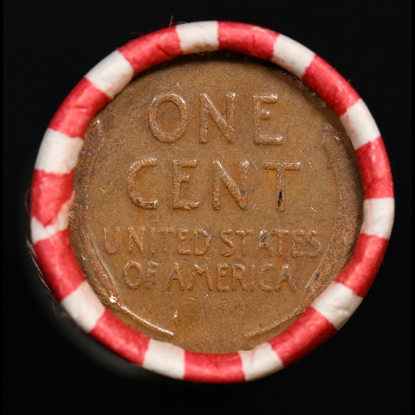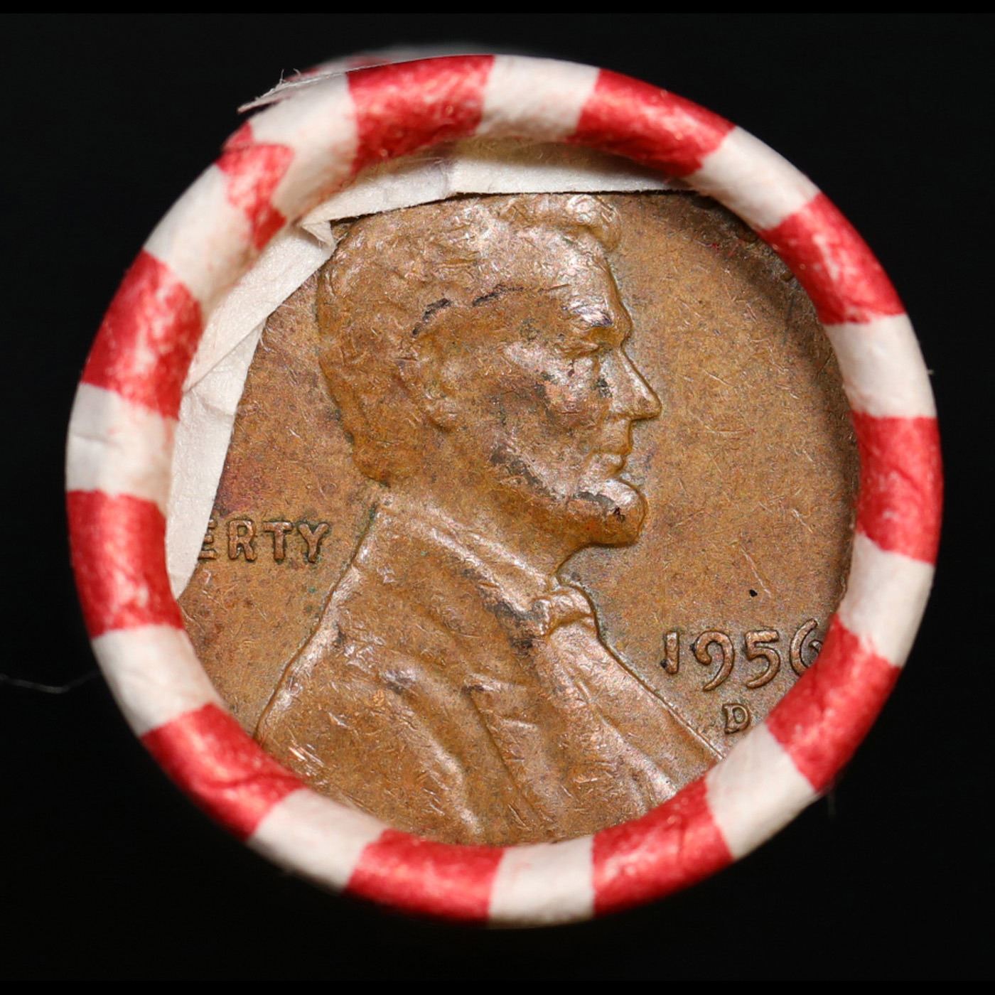Mixed small cents 1c orig shotgun roll, 1956-d Wheat Cent, Wheat Cent other end, Brinks Wrapper.