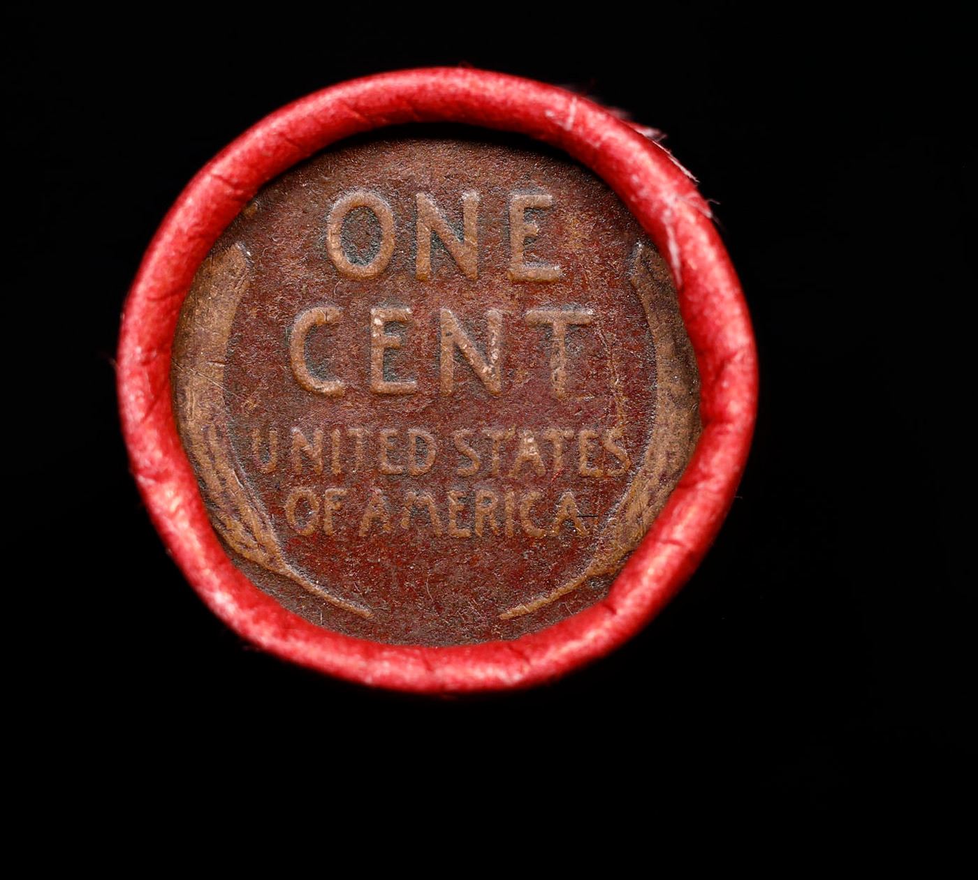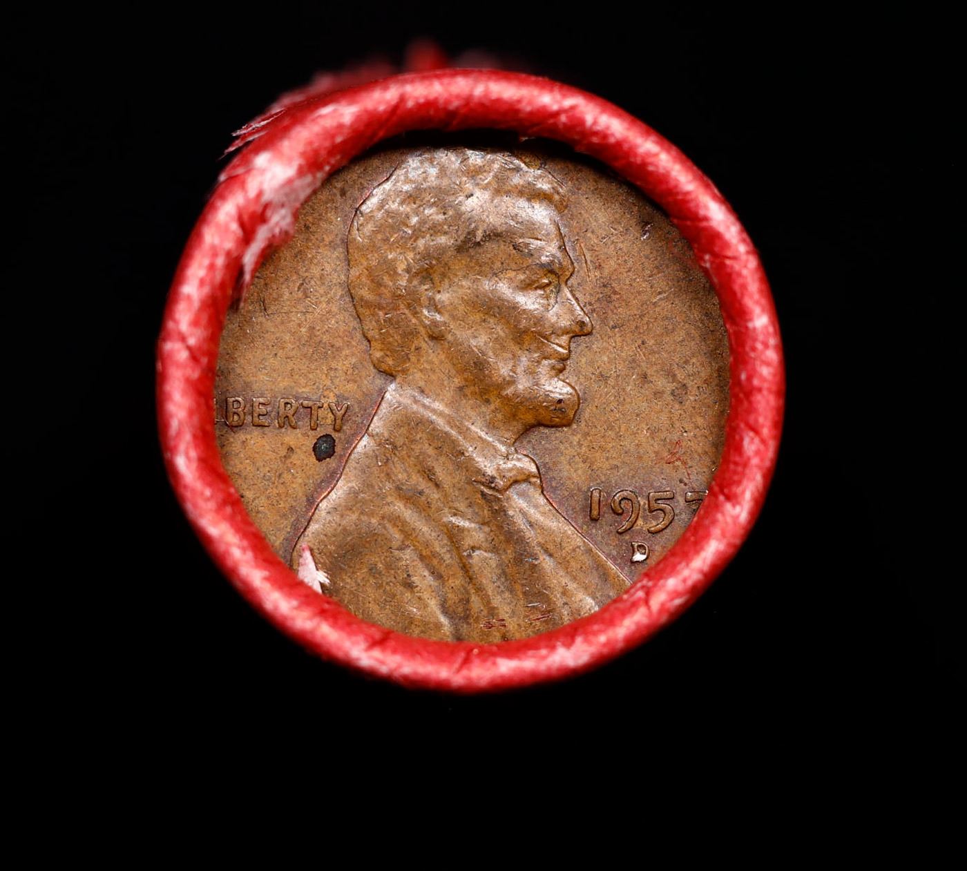 Mixed small cents 1c orig shotgun roll, 1957-d Lincoln Cent, Wheat Cent other end, Coca Cola Brandt