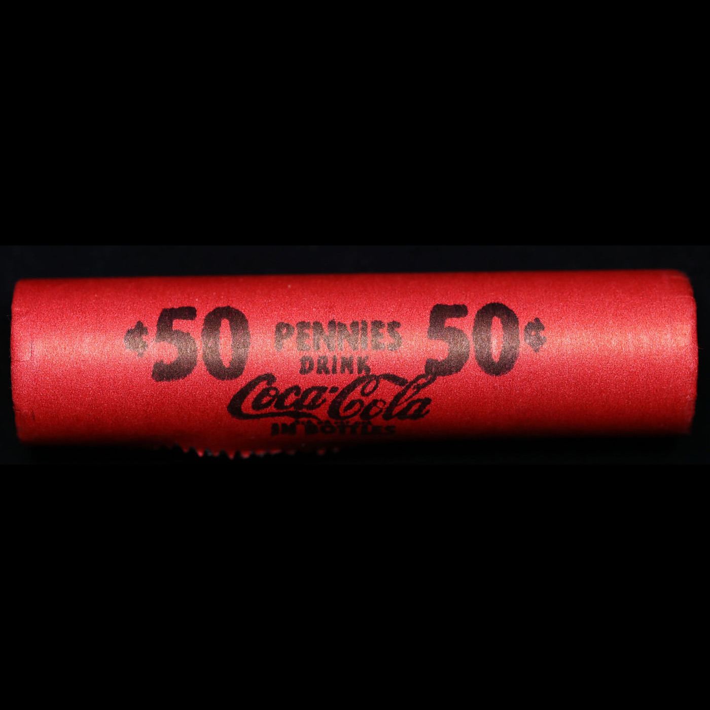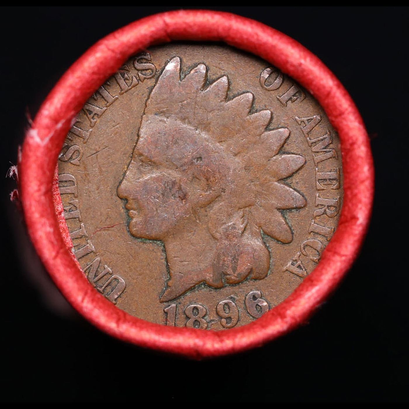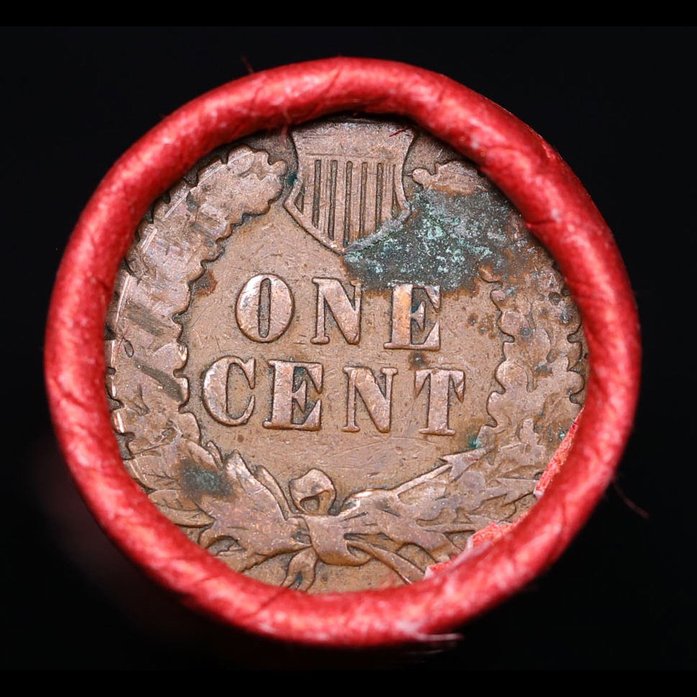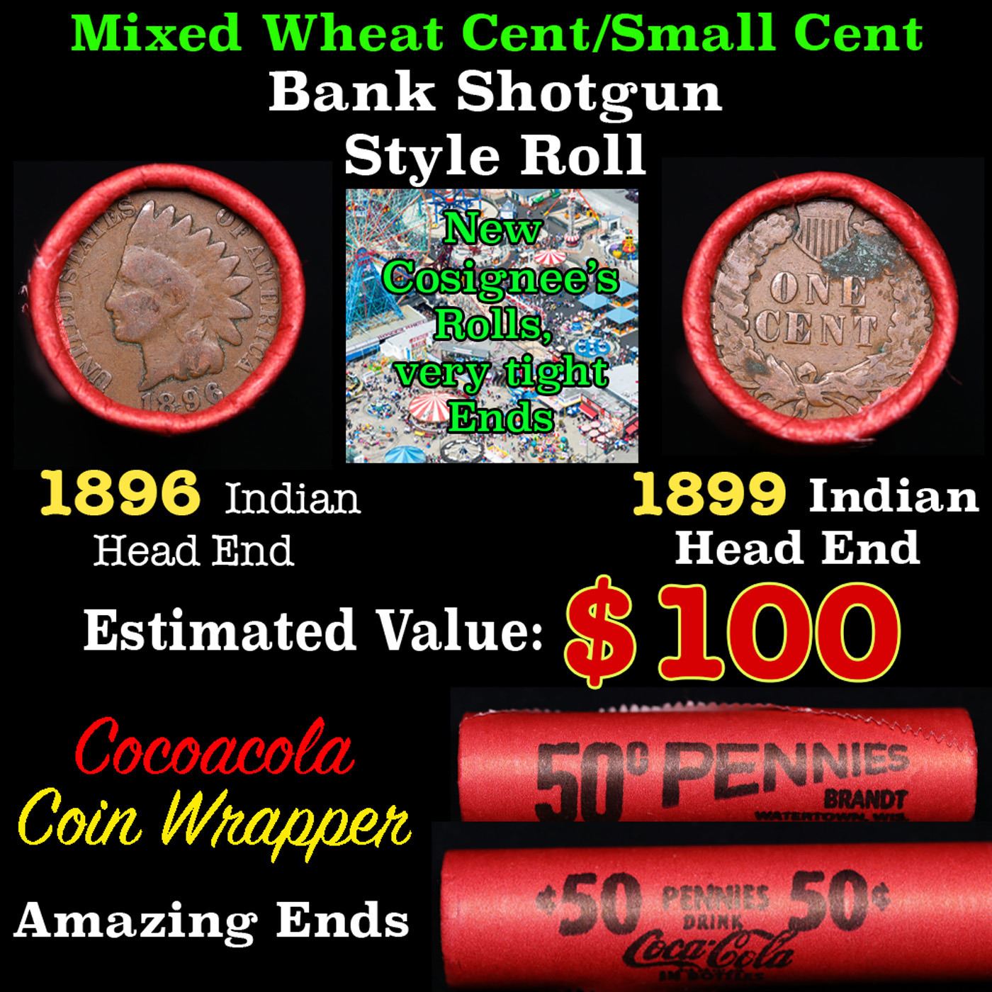 Mixed small cents 1c orig shotgun roll, Wheat Cent, 1896 Indian Cent other end, Coke Wrapper.