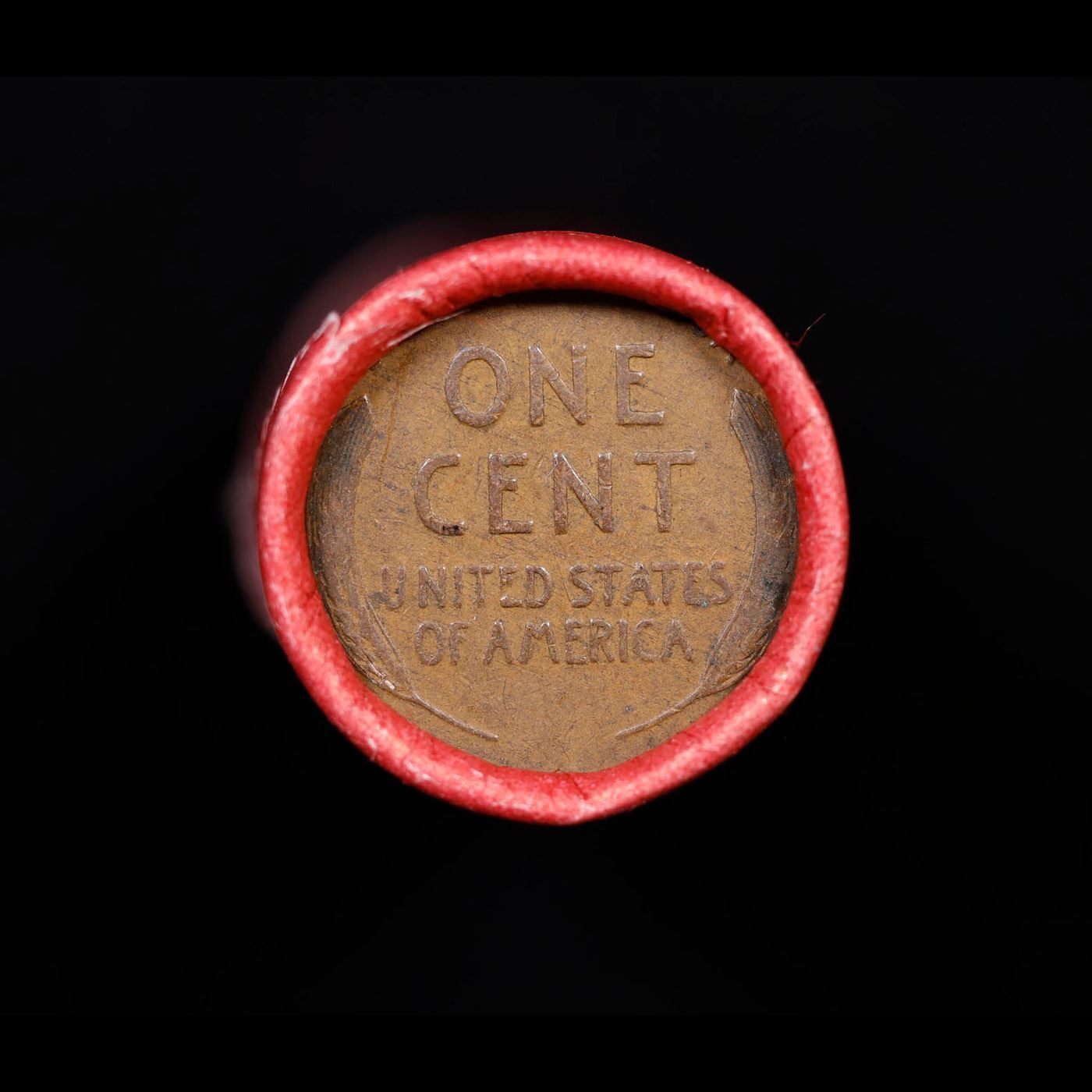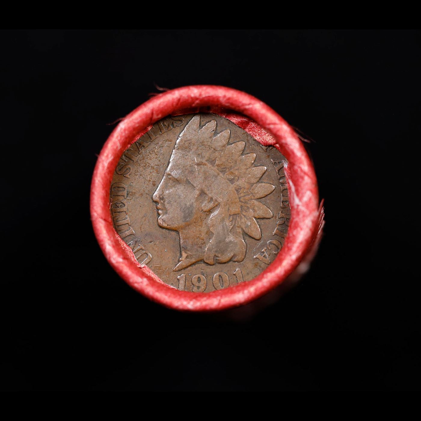 Mixed small cents 1c orig shotgun roll, Wheat Cent, 1901 Indian Cent other end, Coca Cola Brandt Wra