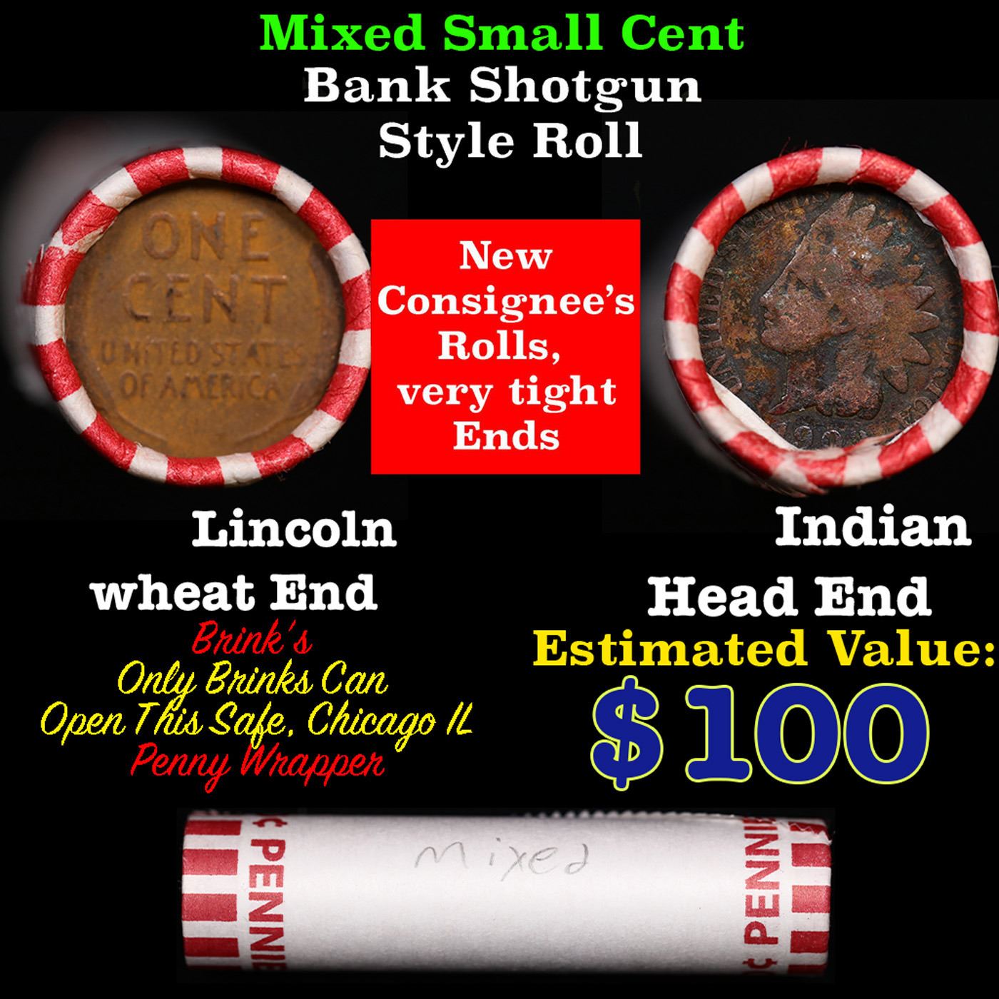 Mixed small cents 1c orig shotgun roll, Wheat Cent, 1903 Indian Cent other end, Brinks Wrapper.. The roll is held in an old Rare & Collectable Brinks 'Only Brinks Can Open This Safe, Chicago IL' Penny wrapper. Actual roll pictured is the roll you will get. A great original bank shotgun roll with very tight ends. We have opened a few of these rolls. They seem to be mixed small cents including Indians, Wheats, Steel cents & some Flying Eagles mixed in. These shotgun rolls are all from a new consignee. They are all frrom one Estate.