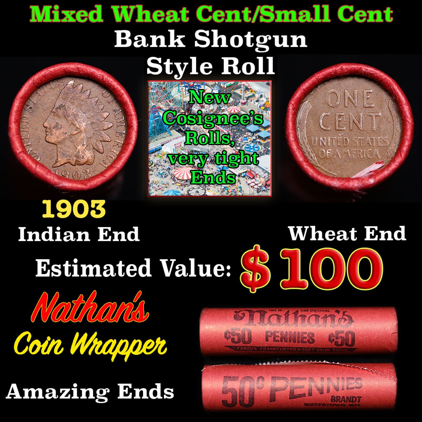 Mixed small cents 1c orig shotgun roll, Wheat Cent, 1903 Indian Cent other end, Nathan's Brandt Wrapper.. The roll is held in an old Rare & Collectable Brinks 'Only Brinks Can Open This Safe, Chicago IL' Penny wrapper. Actual roll pictured is the roll you will get. A great original bank shotgun roll with very tight ends. We have opened a few of these rolls. They seem to be mixed small cents including Indians, Wheats, Steel cents & some Flying Eagles mixed in. These shotgun rolls are all from a new consignee. They are all frrom one Estate.