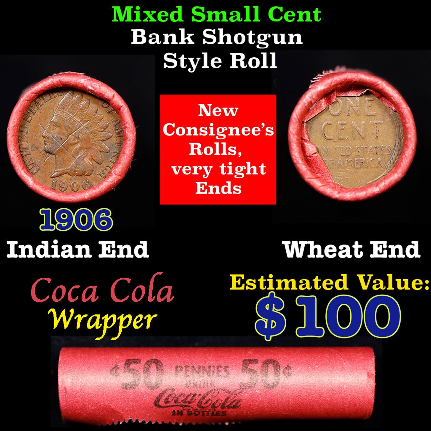 Mixed small cents 1c orig shotgun roll, Wheat Cent, 1906 Indian Cent other end, Coca Cola Brandt Wrapper.. The roll is held in an old Rare & Collectable Brinks 'Only Brinks Can Open This Safe, Chicago IL' Penny wrapper. Actual roll pictured is the roll you will get. A great original bank shotgun roll with very tight ends. We have opened a few of these rolls. They seem to be mixed small cents including Indians, Wheats, Steel cents & some Flying Eagles mixed in. These shotgun rolls are all from a new consignee. They are all frrom one Estate.