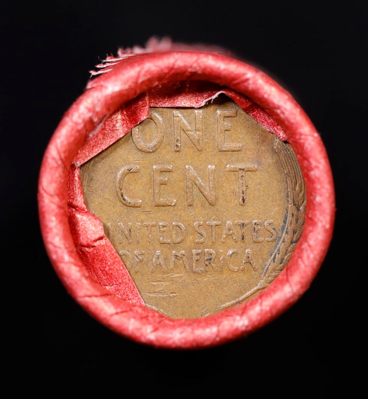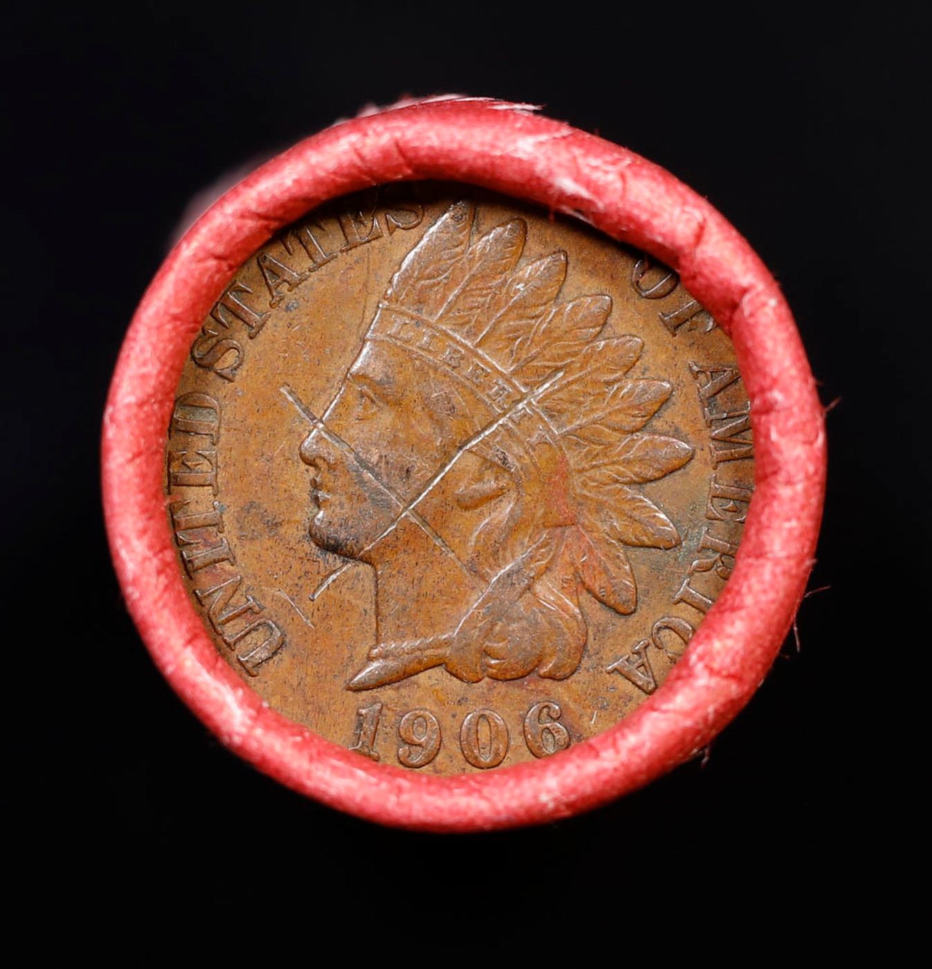 Mixed small cents 1c orig shotgun roll, Wheat Cent, 1906 Indian Cent other end, Coca Cola Brandt Wra