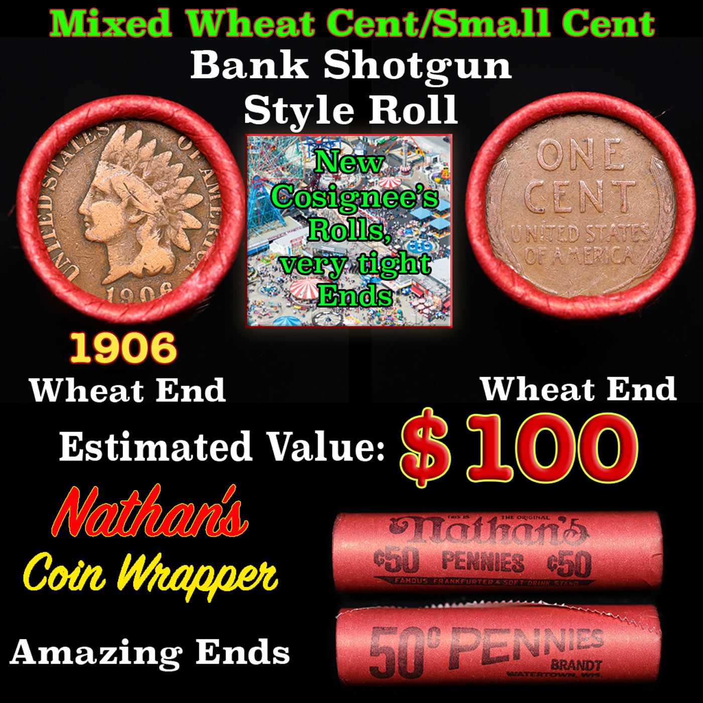 Mixed small cents 1c orig shotgun roll, Wheat Cent, 1906 Indian Cent other end, Nathan's Brandt Wrapper.. The roll is held in an old Rare & Collectable Brinks 'Only Brinks Can Open This Safe, Chicago IL' Penny wrapper. Actual roll pictured is the roll you will get. A great original bank shotgun roll with very tight ends. We have opened a few of these rolls. They seem to be mixed small cents including Indians, Wheats, Steel cents & some Flying Eagles mixed in. These shotgun rolls are all from a new consignee. They are all frrom one Estate.
