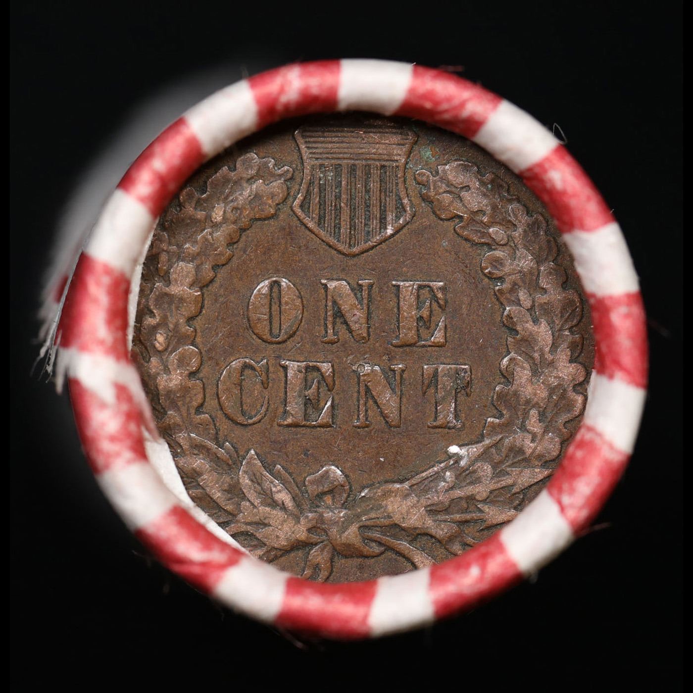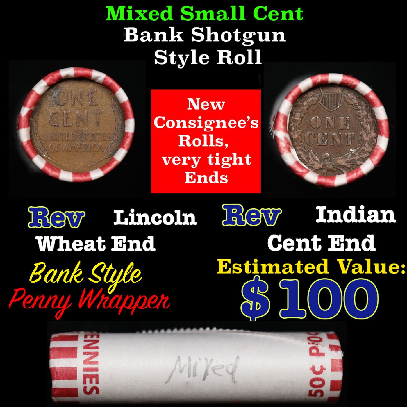 Mixed small cents 1c orig shotgun roll, Wheat Cent End, Indian Cent Other End Bank Wrapper.. The roll is held in an Bank Style Shotgun Roll Actual roll pictured is the roll you will get. A great original bank shotgun roll with very tight ends. We have opened a few of these rolls. They seem to be mixed small cents including Indians, Wheats, Steel cents & some Flying Eagles mixed in. These shotgun rolls are all from a new consignee. They are all frrom one Estate.