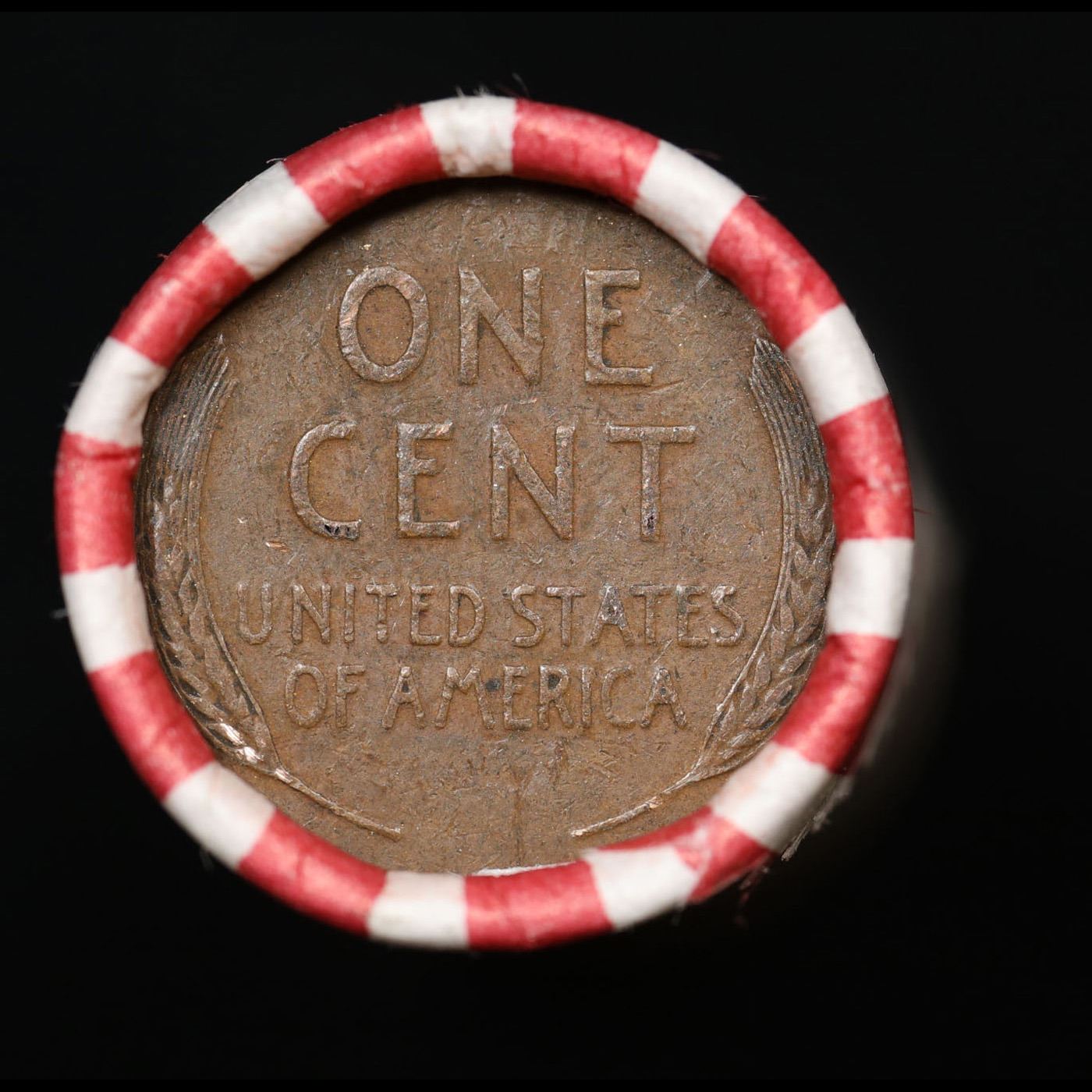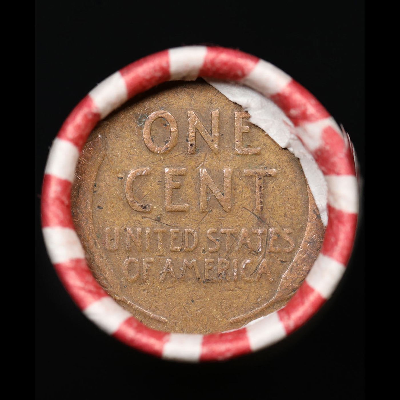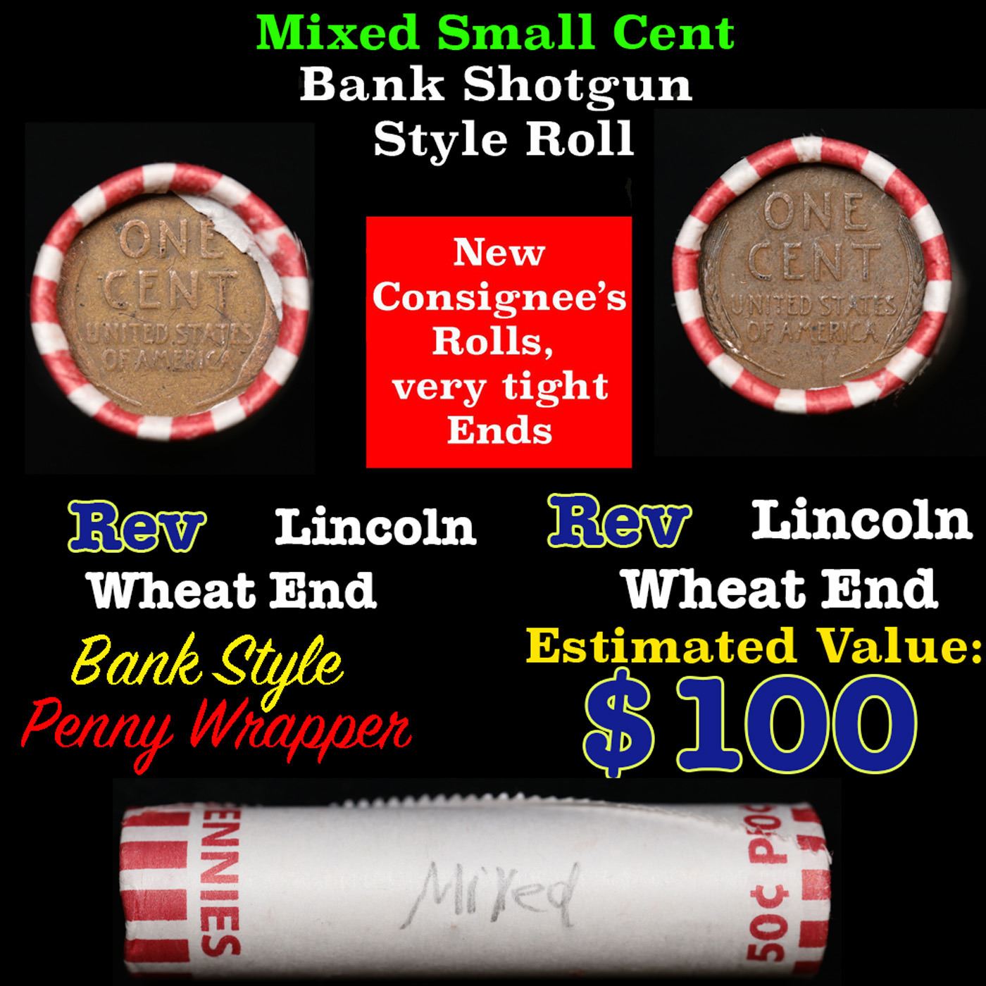 Mixed small cents 1c orig shotgun roll, Wheat Cent Ends, Bank Wrapper.. The roll is held in an Bank Style Shotgun Roll Actual roll pictured is the roll you will get. A great original bank shotgun roll with very tight ends. We have opened a few of these rolls. They seem to be mixed small cents including Indians, Wheats, Steel cents & some Flying Eagles mixed in. These shotgun rolls are all from a new consignee. They are all frrom one Estate.