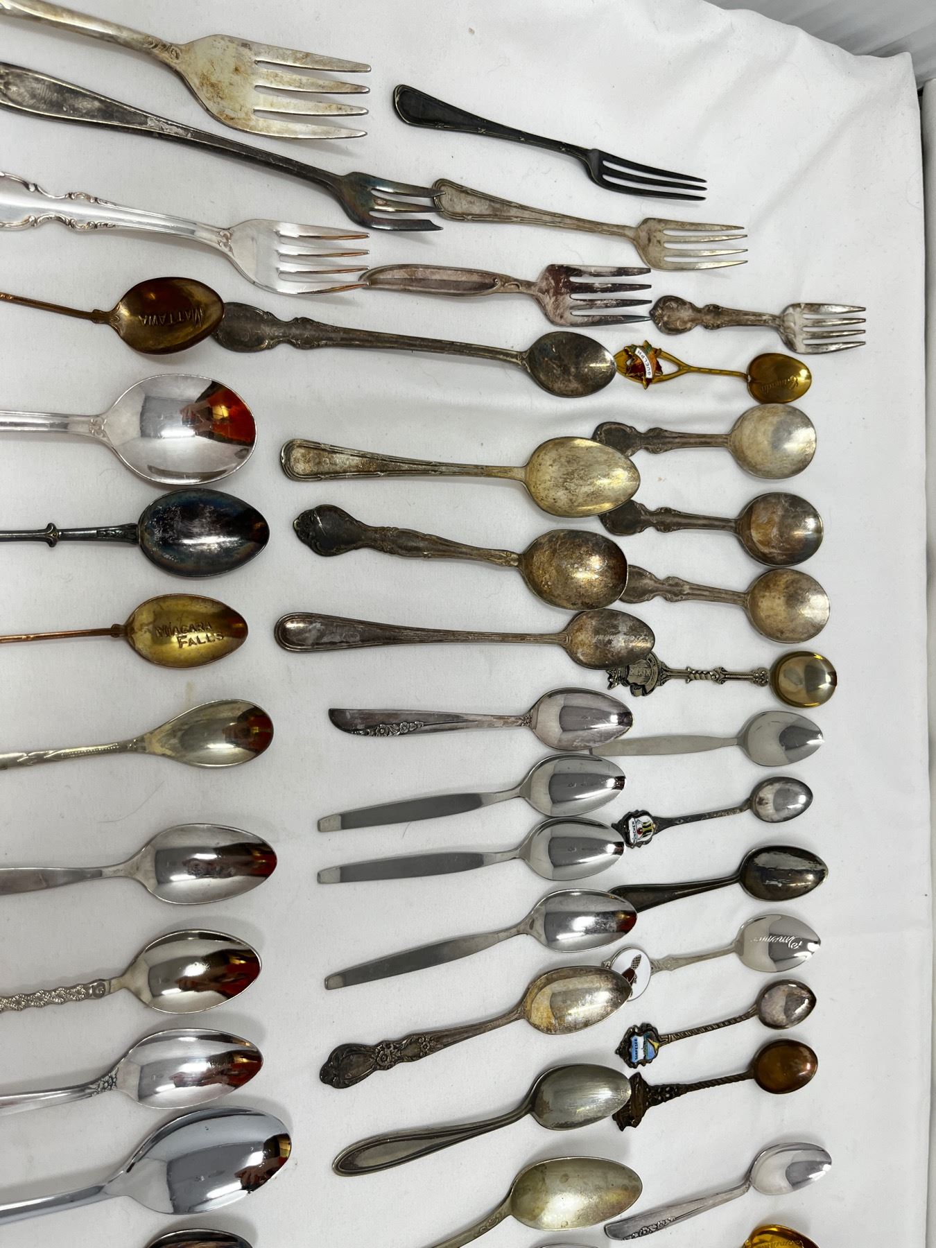 Large assortment of vintage souvenir spoons and cutlery including disney and misc.